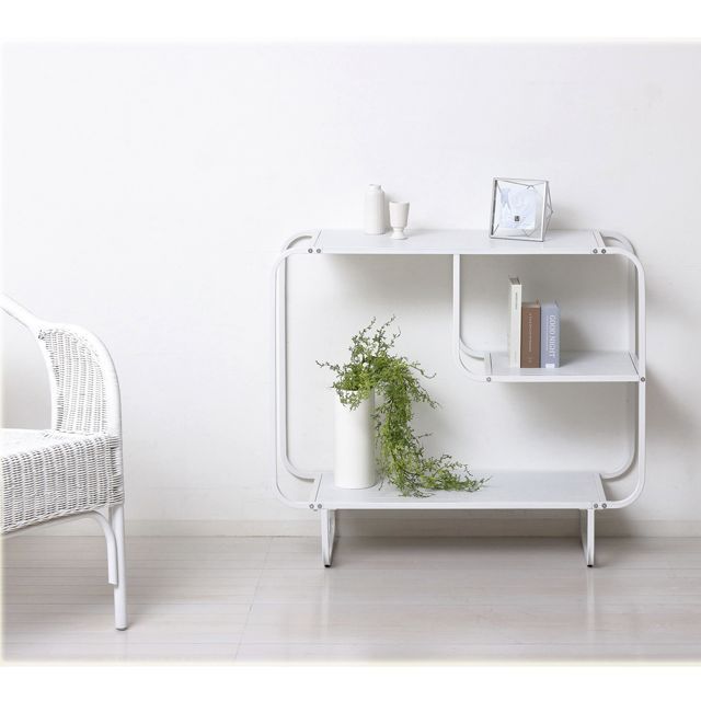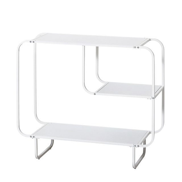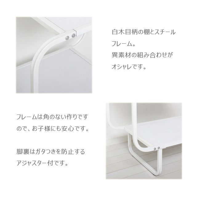 観葉植物やお気に入りの小物のディスプレイに! ◆前後の区別がなくシンプルなデザインですので、間仕切りとしてもお使いいただけます。 ◆お部屋に合わせやすく爽やかなホワイト色です。 ◆白木目柄の棚とスチールフレーム、異素材の組み合わせがおしゃれです。 ◆フレームは角のない作りですので、お子様にも安心です。 ◆脚裏はガタつきを防止するアジャスター付です。 ◆圧迫感のないオープン仕様ですので設置場所を選ばず、どちらを前にしても使えます。