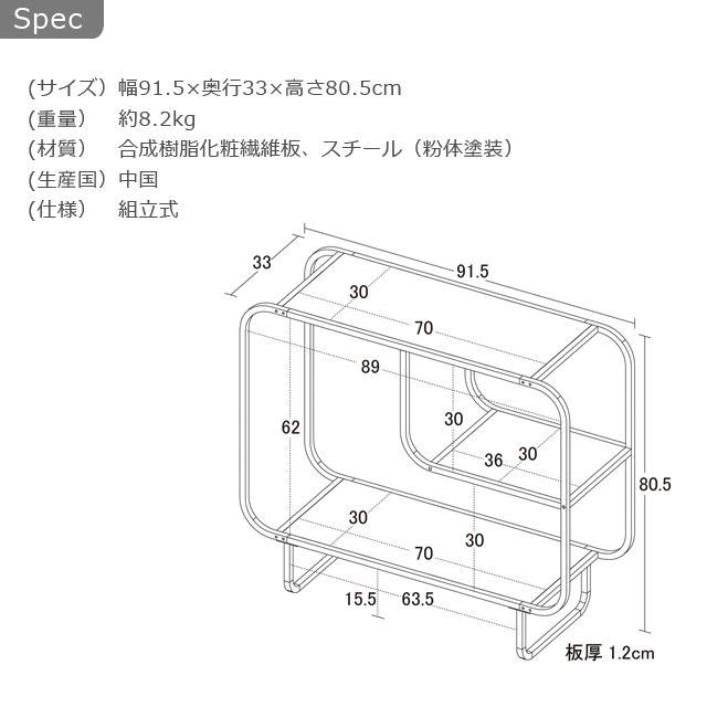 【商品サイズ】約 幅91.5×奥行33×高さ80.5cm 【重 量】約 8.2kg 【梱包サイズ】約 79×34.5×8.5cm(約122cm) 【梱包重量】約 9.5kg 【材 質】合成樹脂化粧繊維板、スチール(粉体塗装) 【仕 様】組立式 【生産国】中国