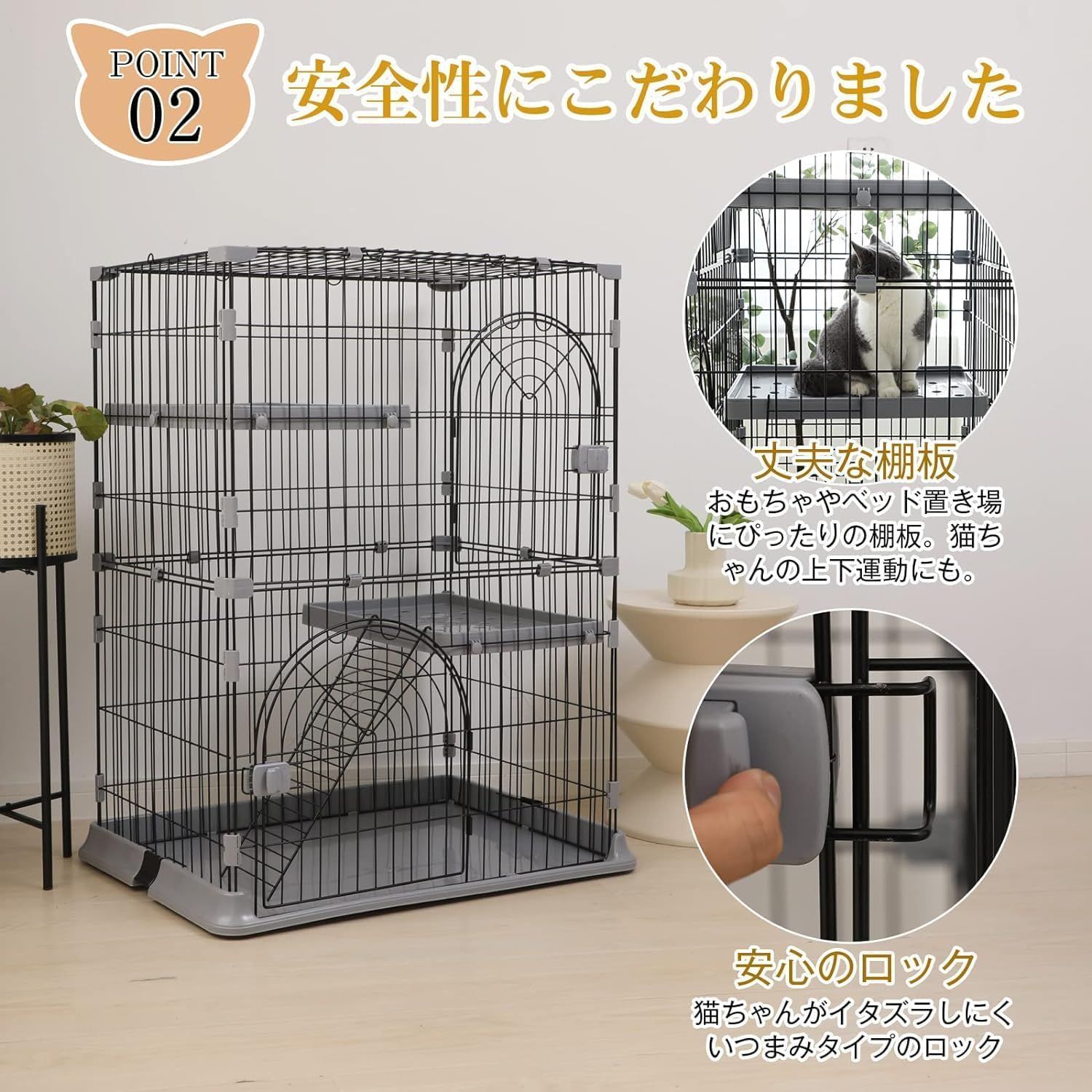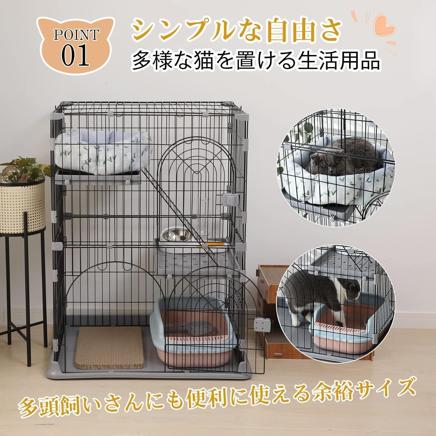 【広々としたスペース 猫のケージ】上下運動もできる高さ。猫ちゃんの好きな玩具を入れて、リラックスできて、楽しく遊んで、運動不足も解消しています。留守中やワンちゃんから目を離す時、いたずらによる怪我や事故の防止にも役立ちますし、緊急時の避難用にも重宝します