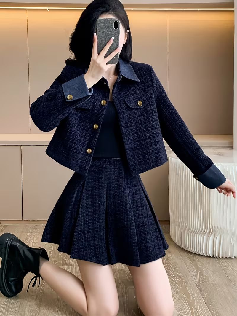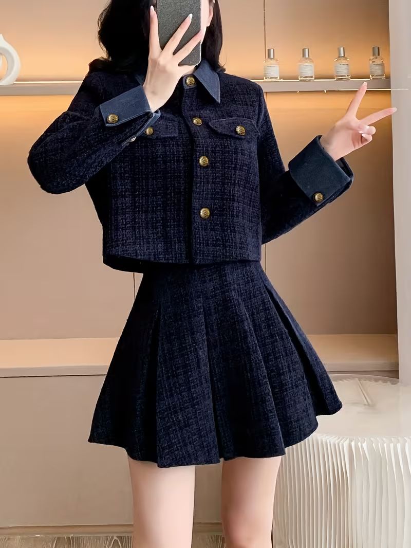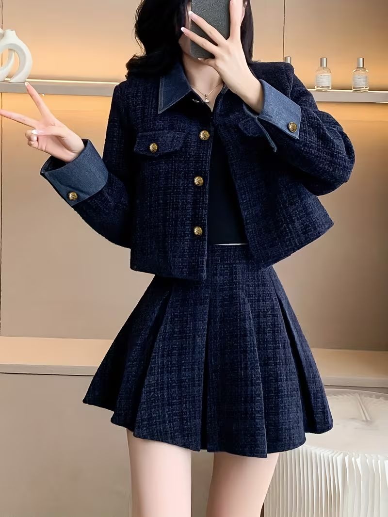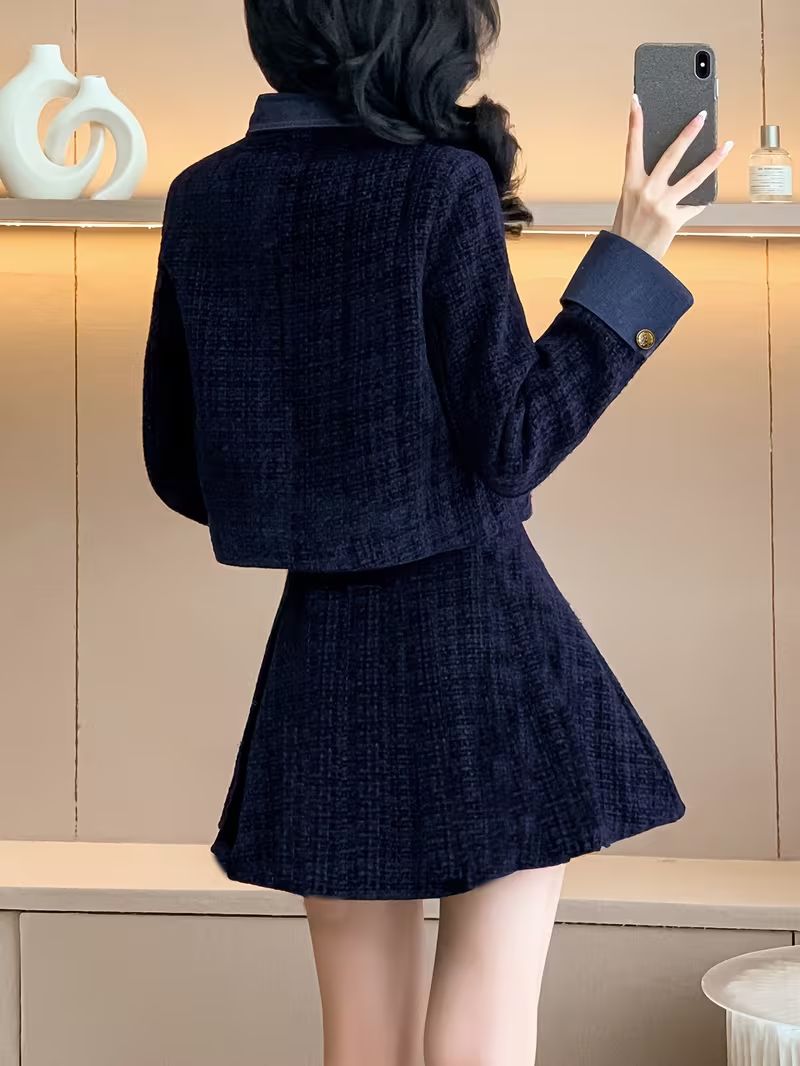 レディース セットアップ 秋冬 コート スカート 2点セット チェック柄 韓国風 フレンチ エレガント 通勤 デート XS〜XXL ネイビー 上下セット