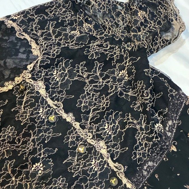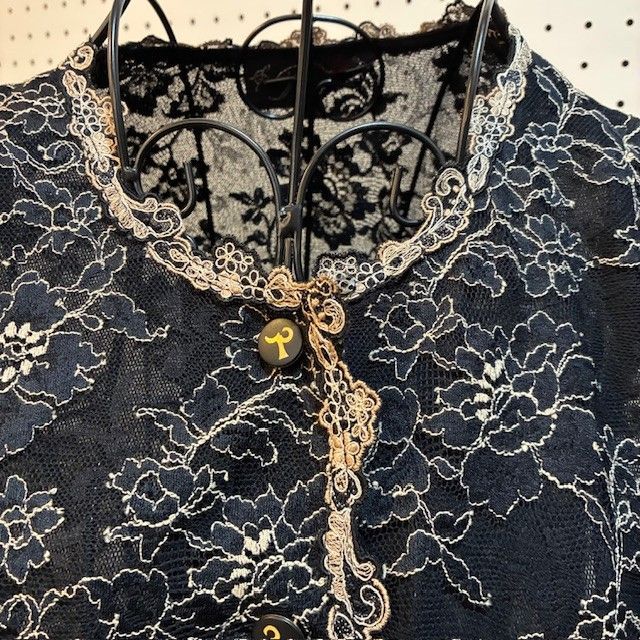 * ディテール: スタンドカラー風のネックラインや、前立てにあしらわれたレースパイピング、上品なボタンなど、細部にわたる手仕事の美しさが光ります。