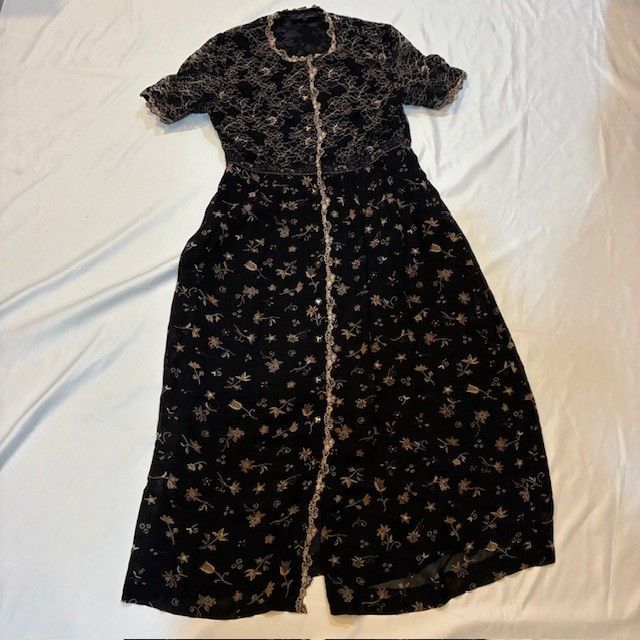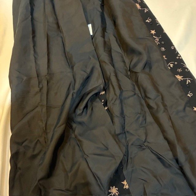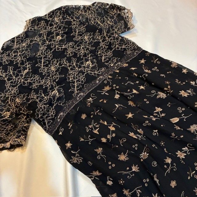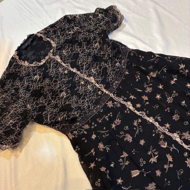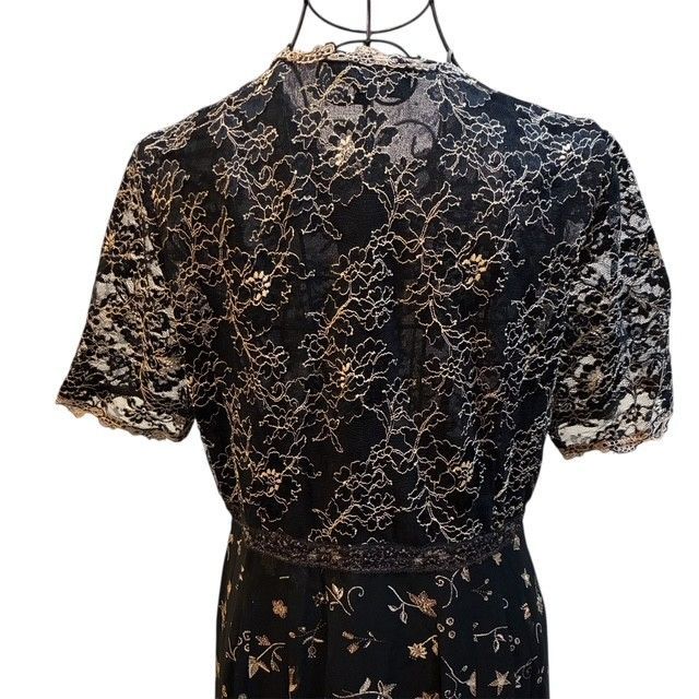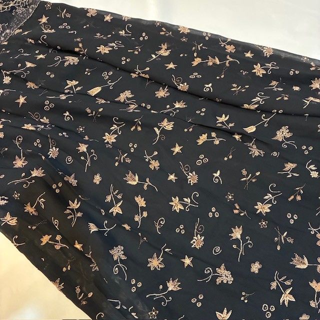 * デザイン: 黒のチュール生地に、ゴールド系の上品な花柄刺繍と星柄が散りばめられた、華やかで繊細なデザイン。トップスは豪華な花柄の総レース仕立てです。