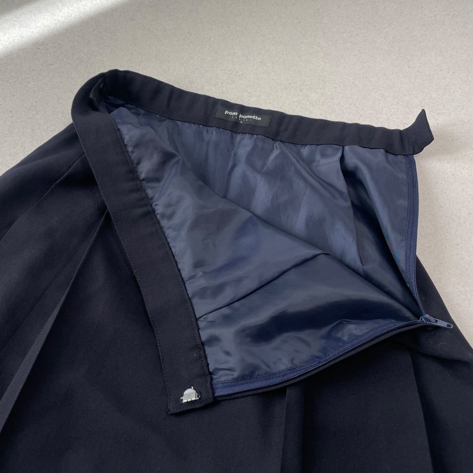 スカートは幅広のプリーツ、ウエストには「pom ponette」のロゴ刺繍がデザインされております。