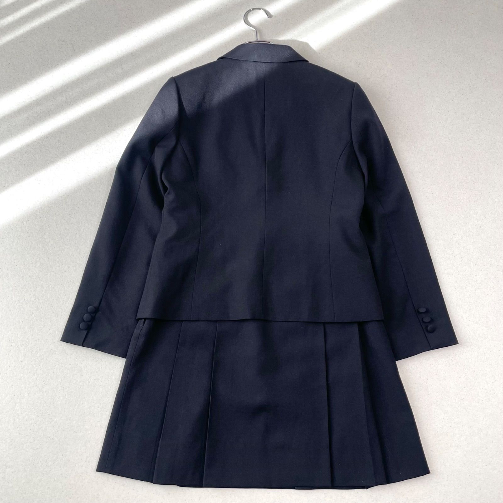 テーラードジャケットとプリーツスカートのスカートスーツセットアップです。