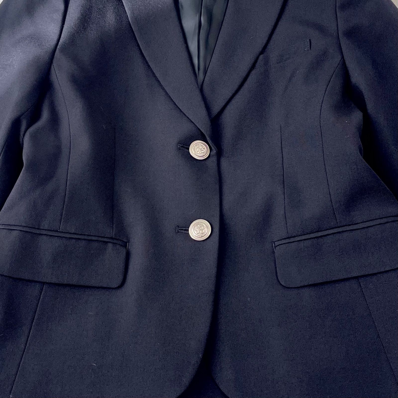 ジャケットには前身頃にはシルバーのボタン、袖にはくるみボタン、ポケットが2つ付いております。