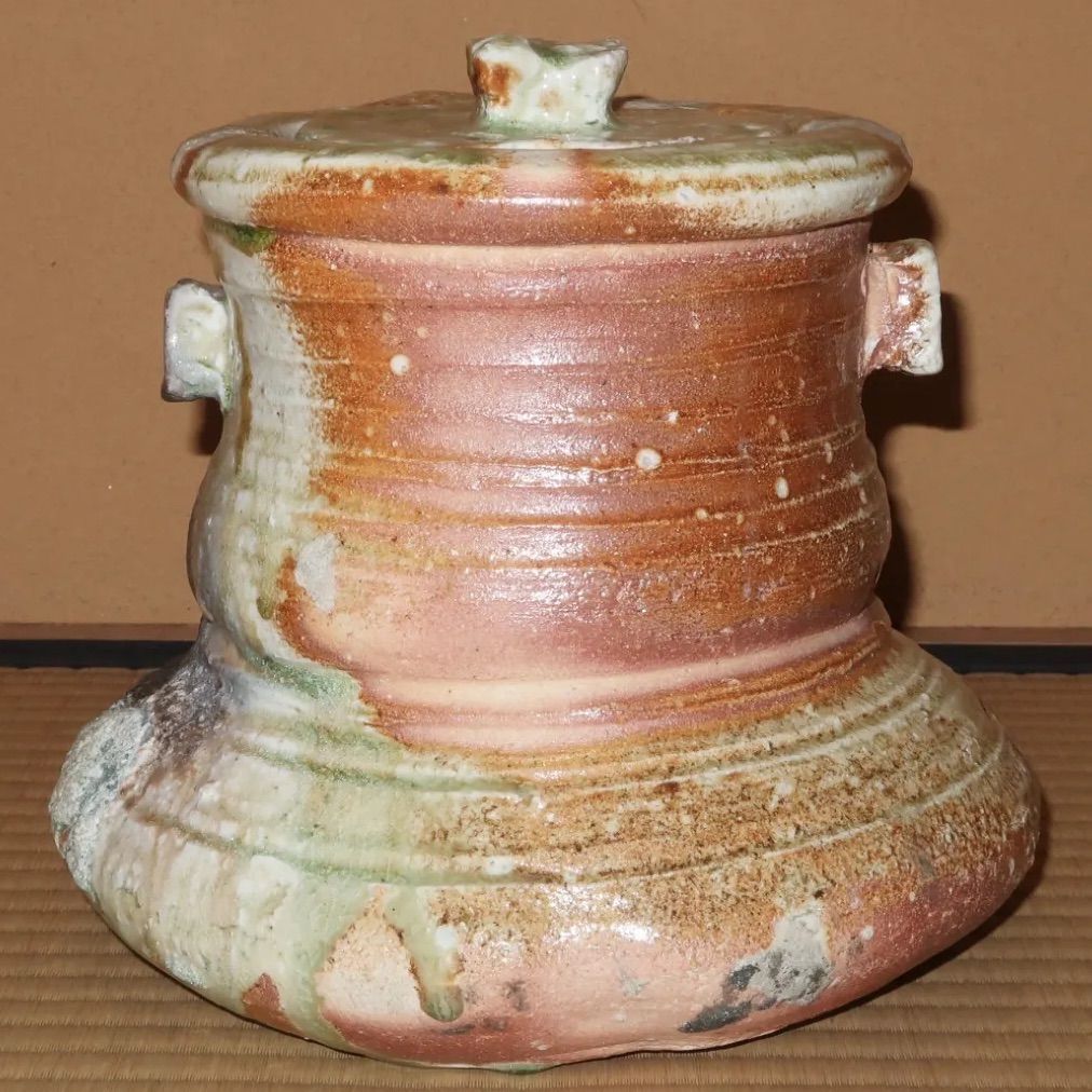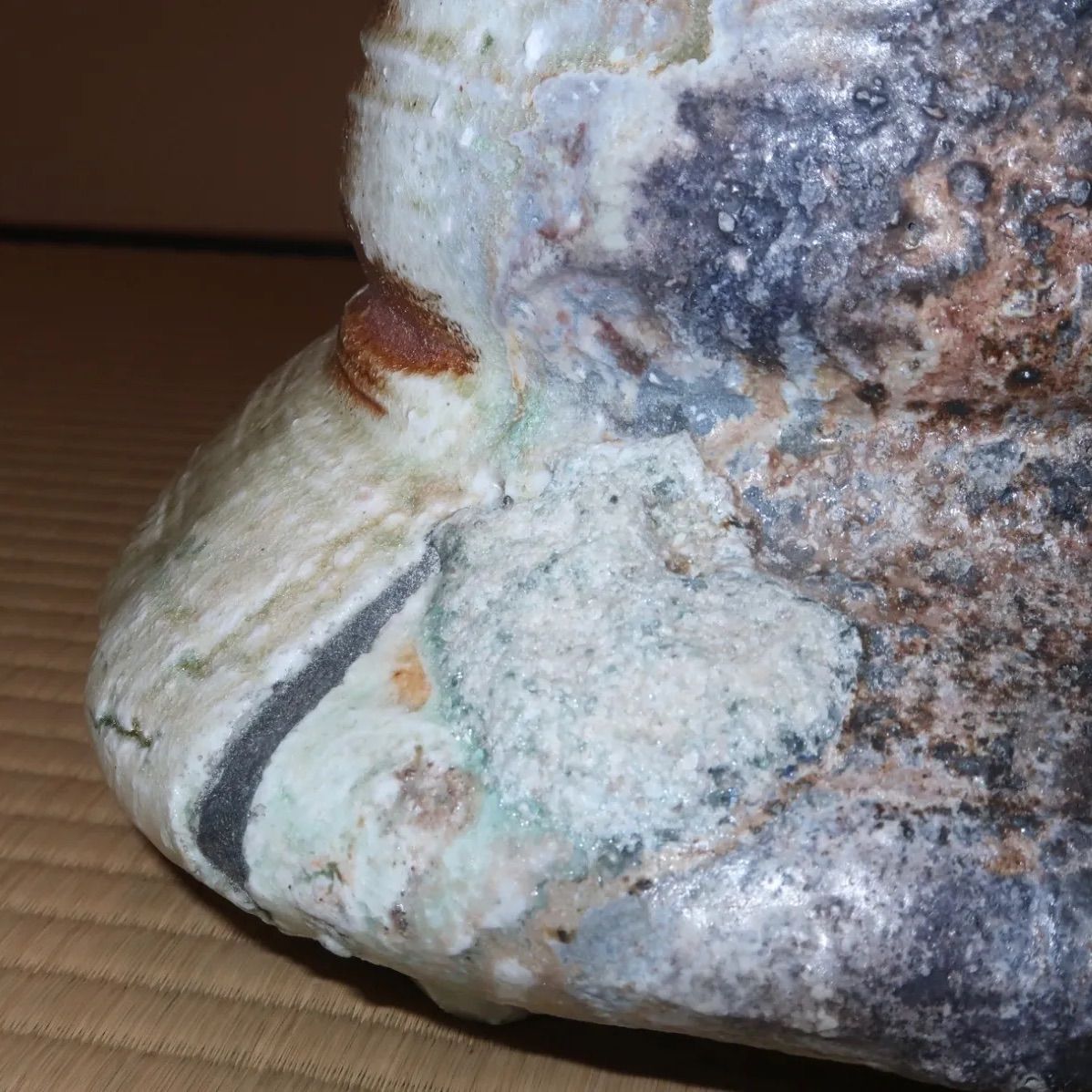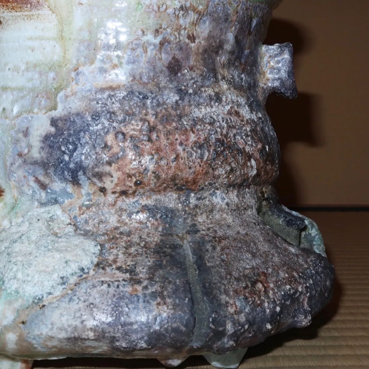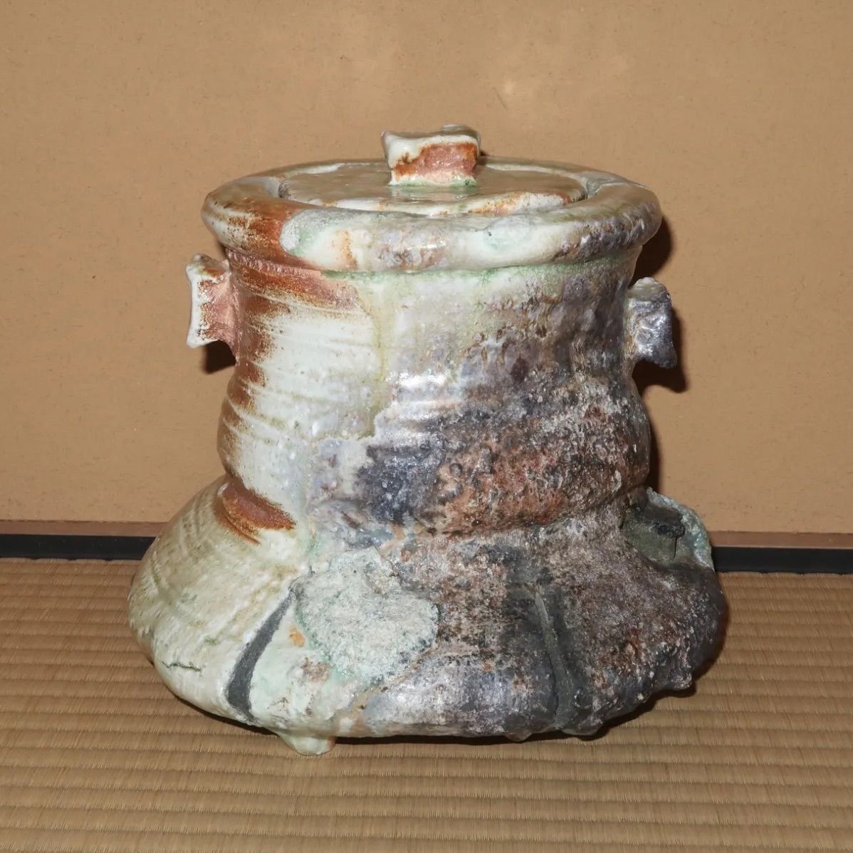 杉本貞光作の伊賀水指です。口造りから胴にかけての大胆な造形に、伊賀焼特有の荒い土味がよく表れ、そこへ自然に流れ落ちたビードロ釉が重なって、窯変の妙を味わえる見事な景色を生んでいます。特に胴に現れる焦げやビードロのたまりは、まさに「土と炎」に身を委ねる貞光ならではの表現で、桃山時代の名品である伊賀破袋水指を踏まえた写しの精神が感じられます。造形的にも桃山陶の量感を思わせつつ、貞光独自の侘びた気配が宿り、写しでありながら写しに留まらない格調を備えています。裏面は素焼きのような風合いに仕上げられ、表裏で対照的な表情を楽しめる点も魅力です。さらに川瀬表完作の塗蓋が添えられている点も茶人としてはありがたいものです。小間や台目棚に合わせれば、茶席を豊かにしてくれるご馳走の一作といえます。