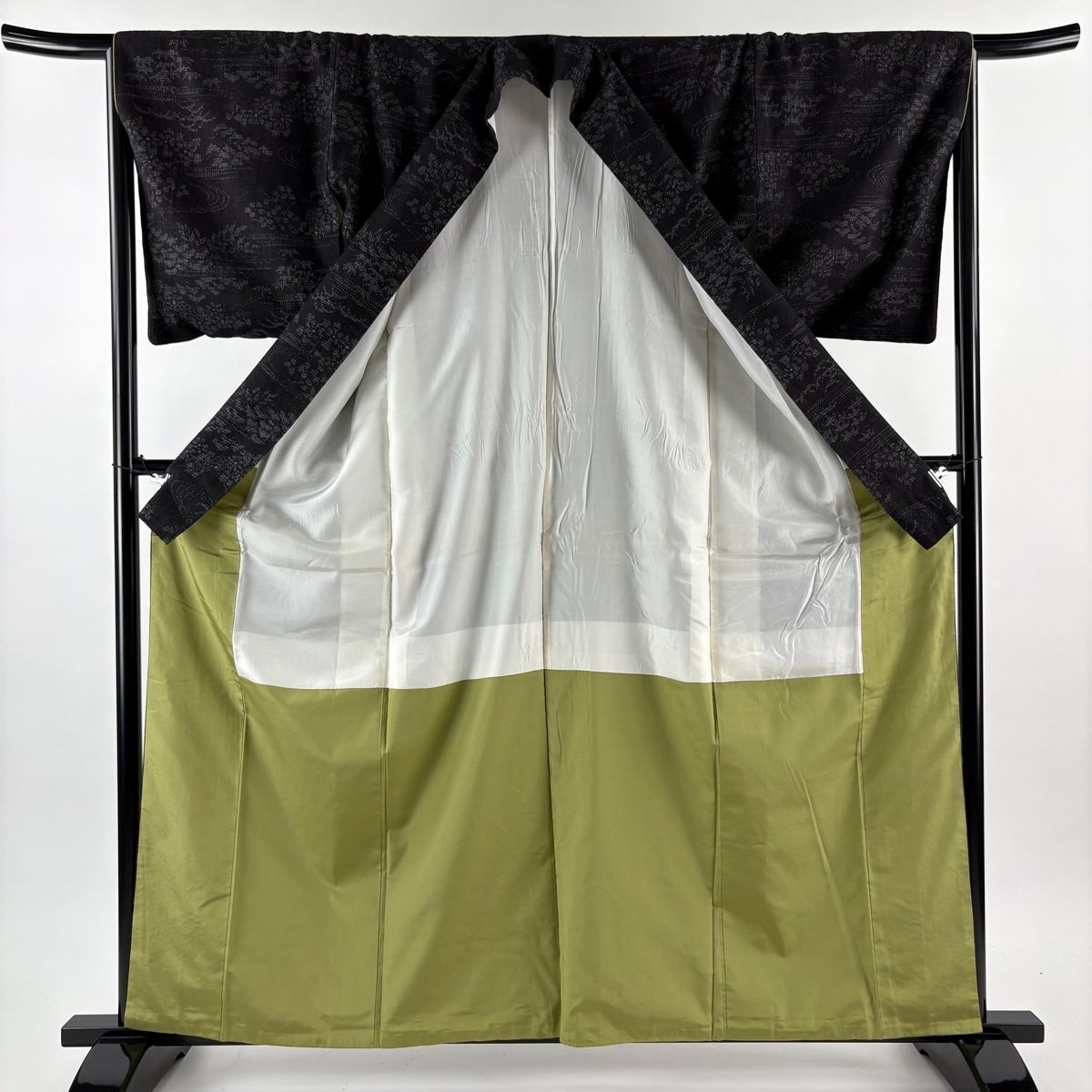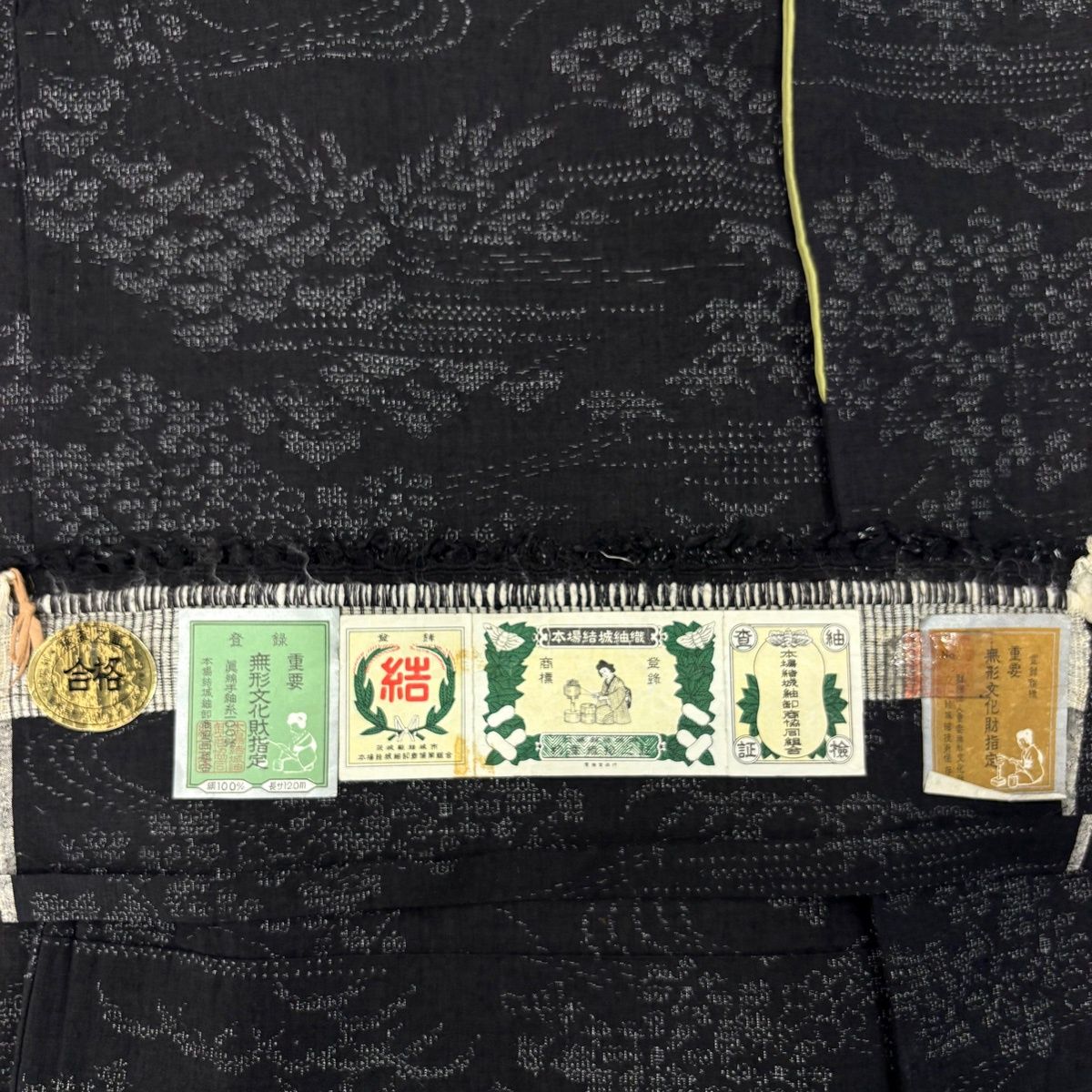 結城紬 身丈162cm 裄丈65cm M 袷 本場結城紬 証紙 松竹梅 流水 黒 正絹