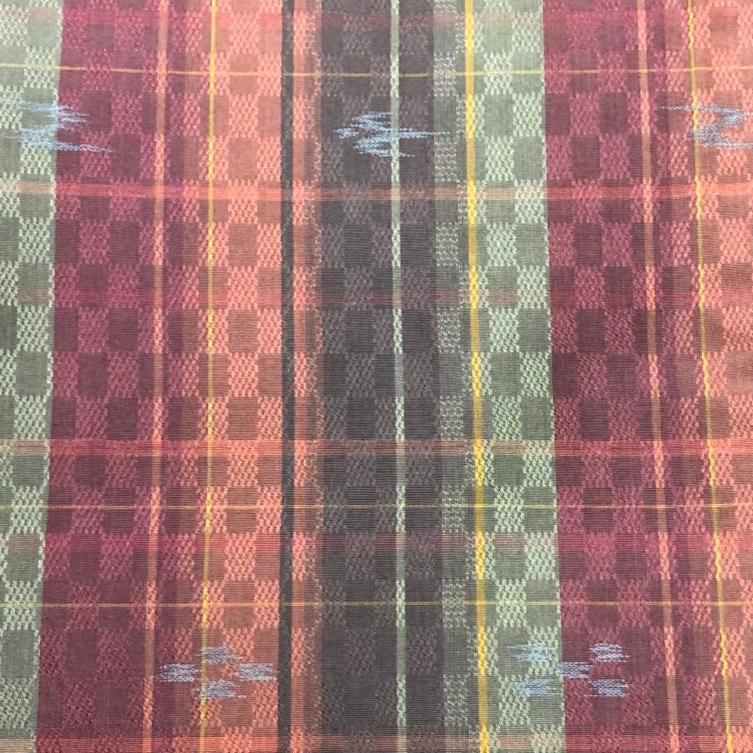 縦縞模様に市松、琉球柄の絣模様がデザインされた素敵なお品でございます。
