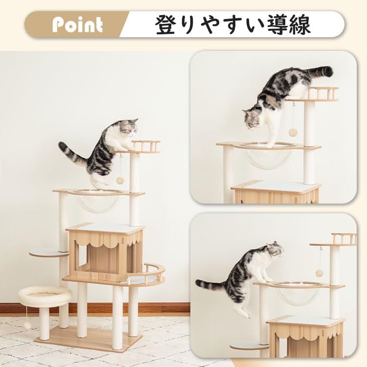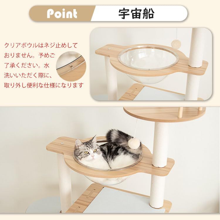 【なになにLife】 キャットタワー 木製 高さ128cm 大型猫 据え置き 大型 おしゃれ ワイドタイプ 多頭飼い 高級 豪華 スリム 猫タワー 宇宙船 中型 猫 爪研ぎポール 見晴台付き 天然麻紐 キャットツリー 宇宙船2個 クリアボウル 隠れ家 爪とぎ 安定 運動不足解消 麻紐 猫ハウス スクラッチ ホワイトコットン紐