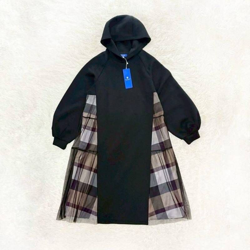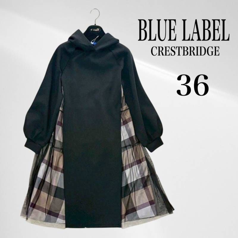 ブルーレーベル クレストブリッジ バック チュール ポンチ ドレス チェック 黒 ブラック 36 ワンピース ひざ下 フード
