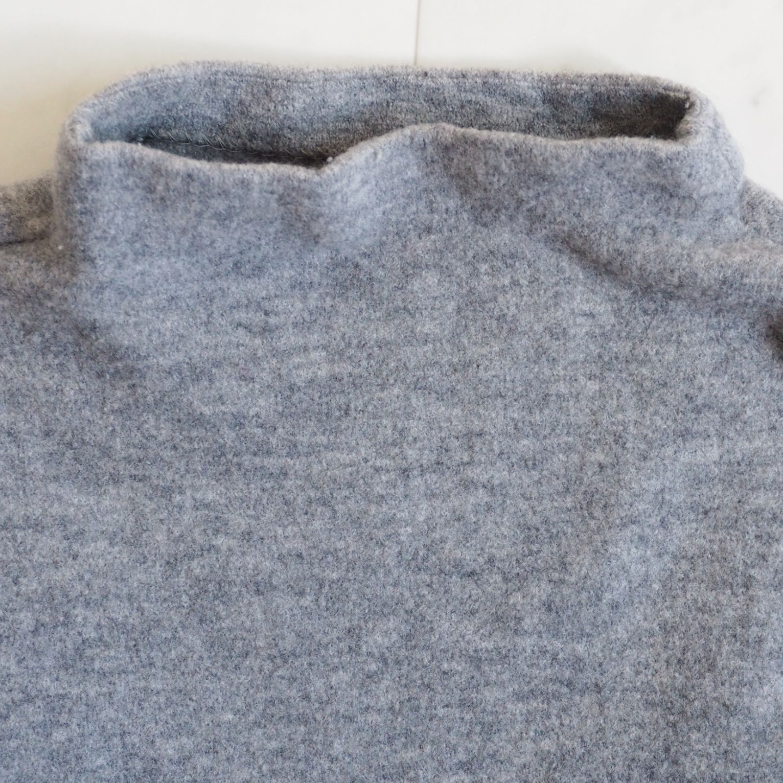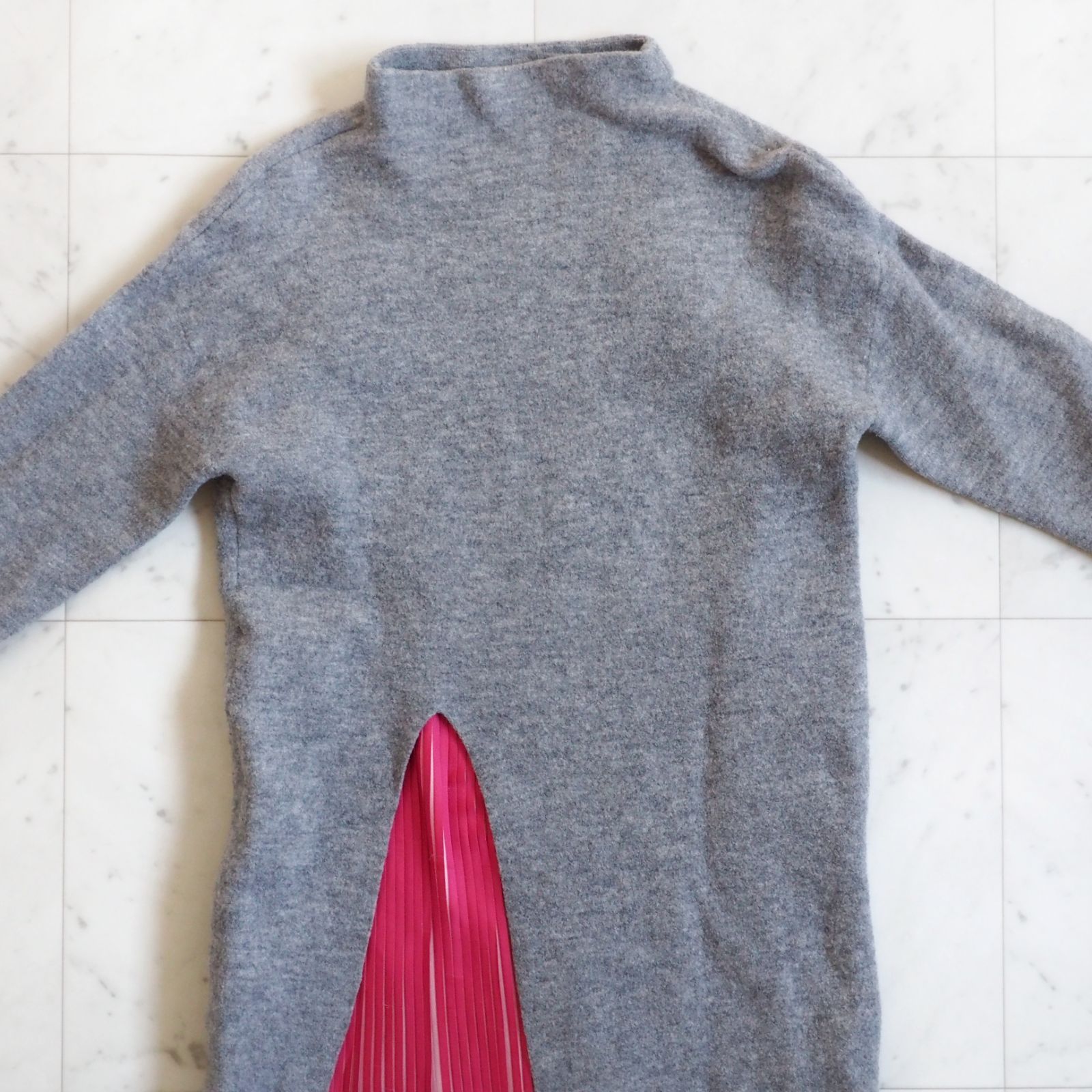 肉厚なフェルトウールのやわらかい身頃にスリットのプリーツがドッキングされたデザイン。