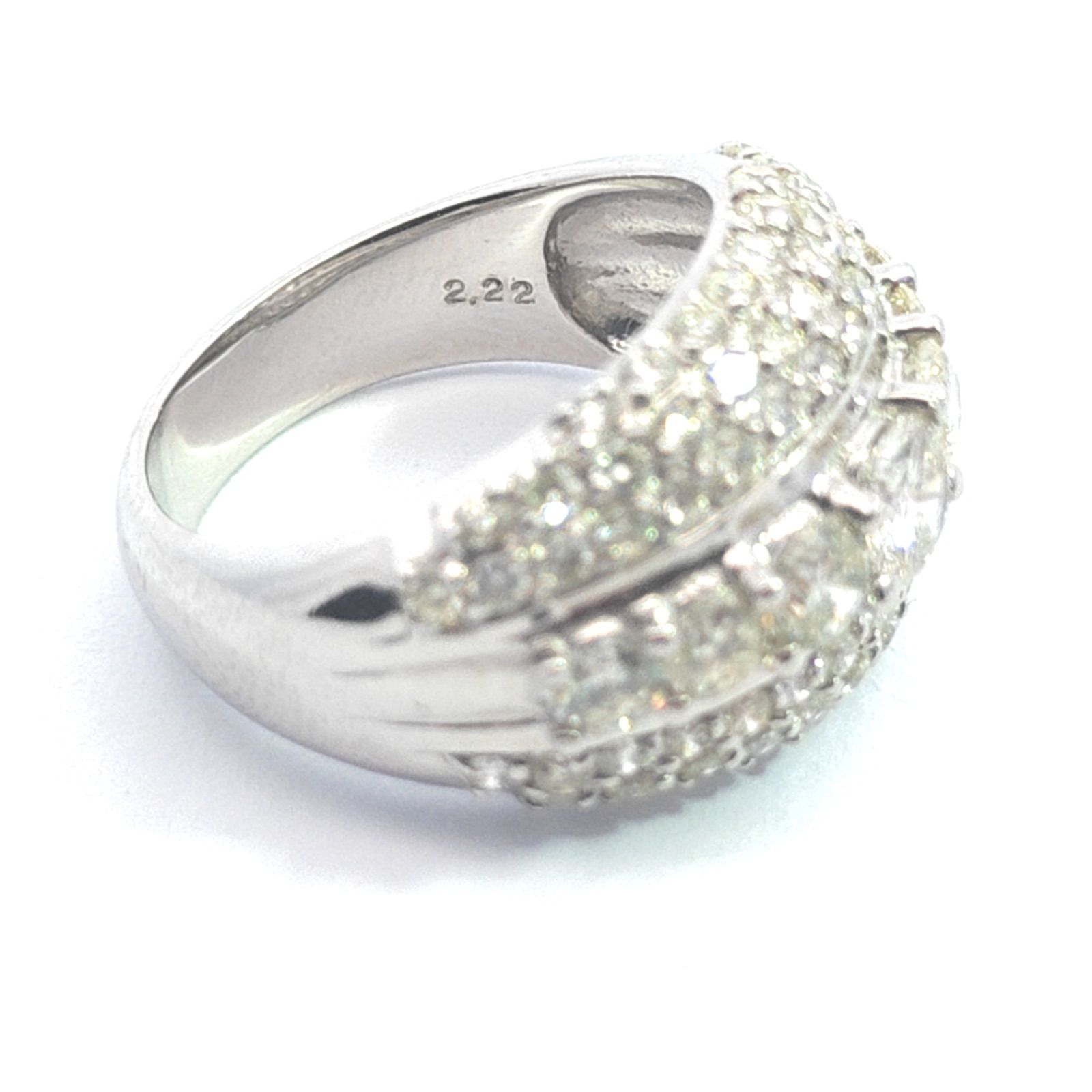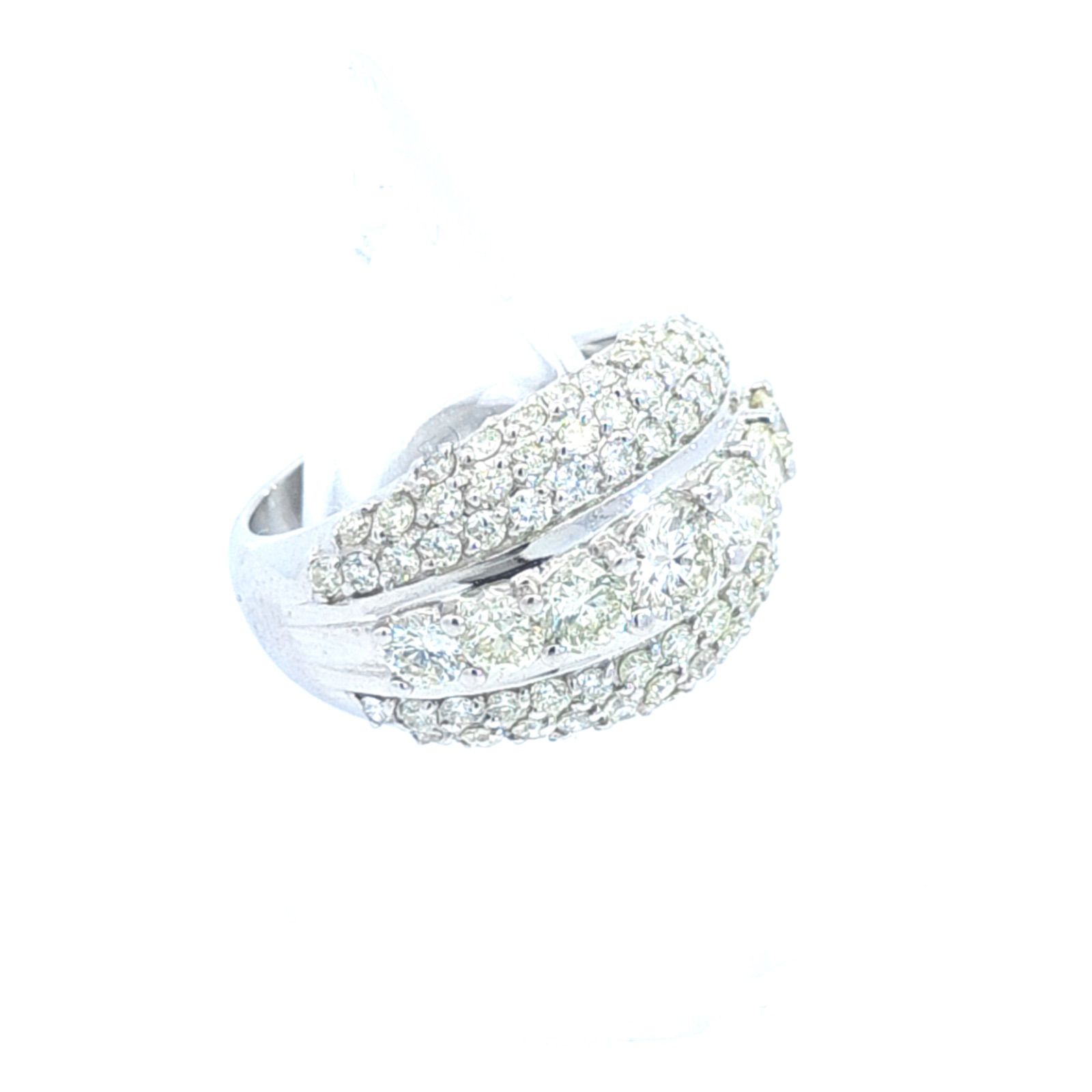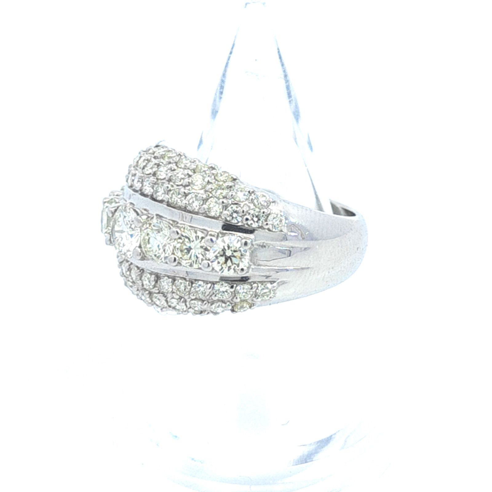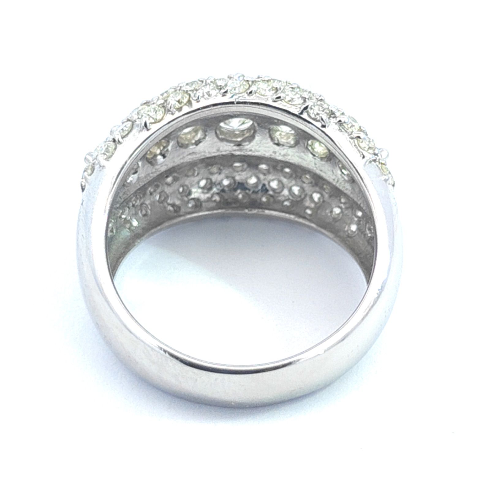 【商品説明】この指輪は非常に幅広で、多数のダイヤモンドが使われた豪華なデザインです。中央には大きめのダイヤが横一列に並び、上下は細かいメレダイヤで密に詰められたパヴェセッテングが施されています。