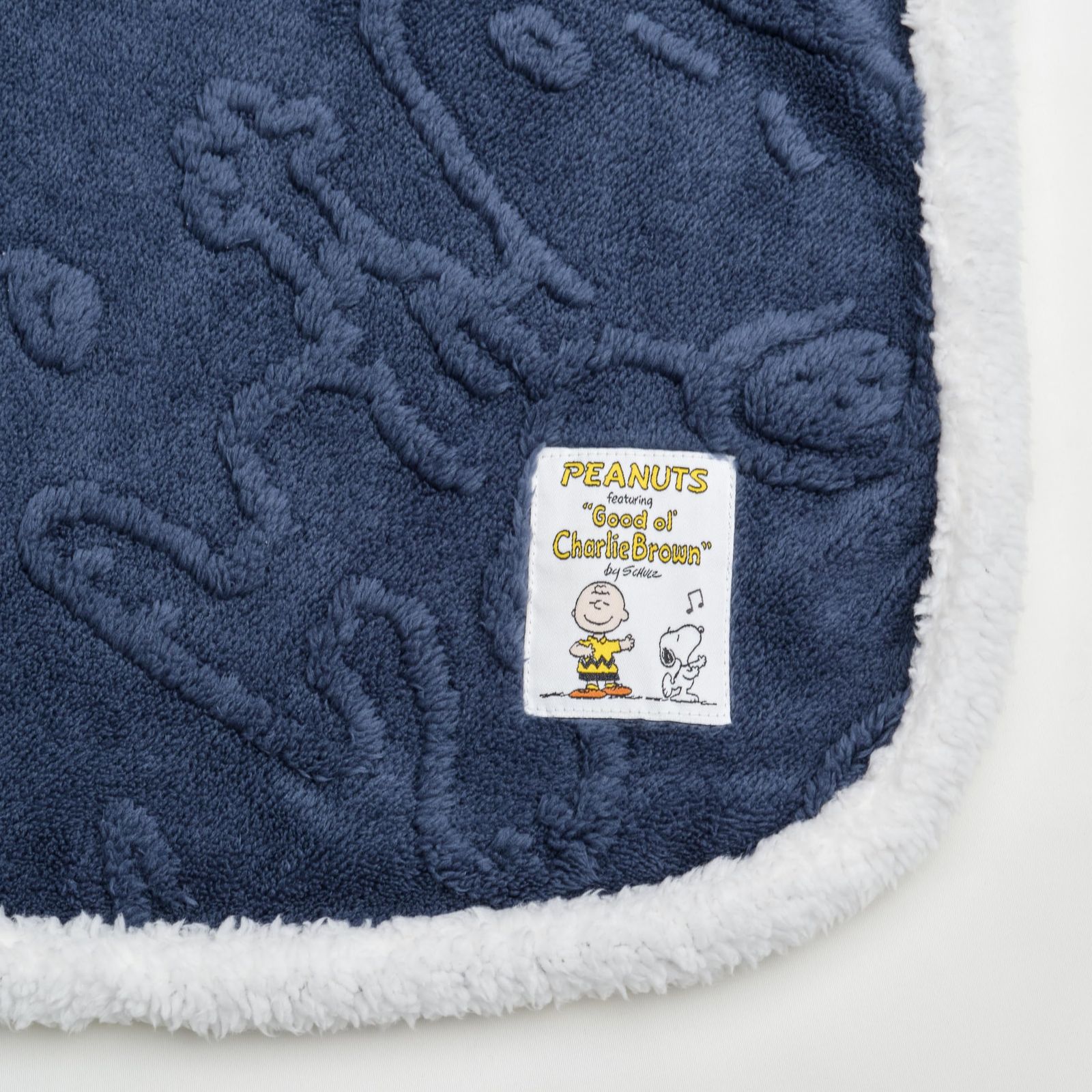 浮き出た凹凸感のあるジャカードボア生地でダンスしているスヌーピーを大人かわいくデザインした毛布。ダンスしているチャーリー・ブラウンとスヌーピーの可愛いラベルがワンポイント。