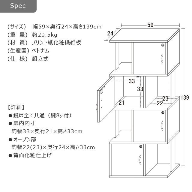 【商品サイズ】約 幅59×奥行24×高さ139cm 【重 量】約 20.5kg 【商品詳細】 ●(扉内内寸)約 幅33×奥行21×高さ33cm ●(オープン部)約 幅22(23)×奥行24×高さ33cm ●鍵8ケ付(すべて共通) 【梱包サイズ】約 65×35.5×18cm(約118.5cm) 【梱包重量】約 21.5kg