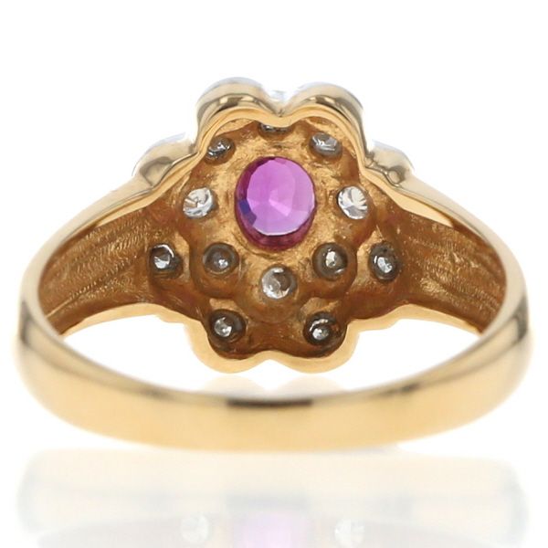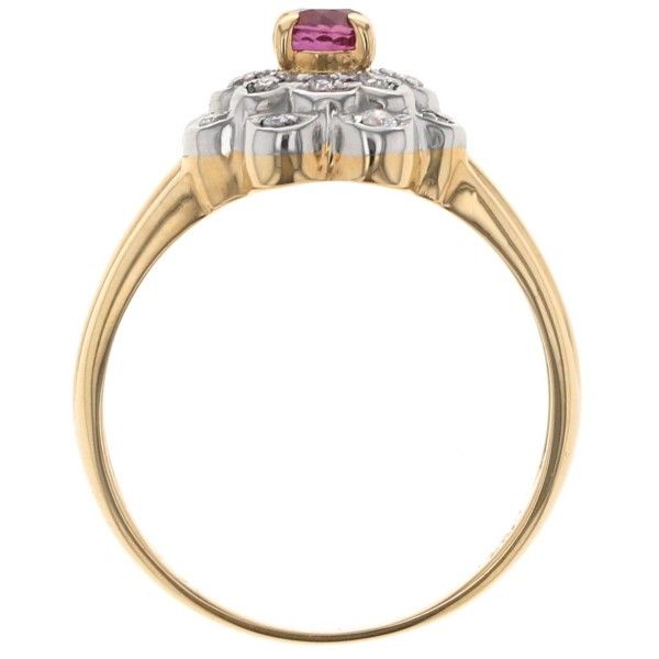 【商品紹介】イエローゴールドとプラチナの素材を組み合わせた、クラシカルで華やかなコンビネーションリングです。リングのトップは、女性らしさを引き立てる優美なフラワーモチーフです。中心には、鮮やかなピンクレッドのオーバルカットルビーがセットされ、その周りを高品質なダイヤモンドが二重に取り巻き、モチーフを構成しています。ダイヤモンドがセッティングされた花びらや取り巻きの部分にはプラチナが使用されており、ルビーの色彩とダイヤモンドの輝きを際立たせています。アーム部分はイエローゴールドで仕上げられており、ゴールドの温かみとプラチナの洗練された白さの美しいコントラストが楽しめます。細部にまでこだわり抜かれた豪華なデザインは、お手元をエレガントかつ可愛らしく演出する、タイムレスな魅力を持つジュエリーです。
