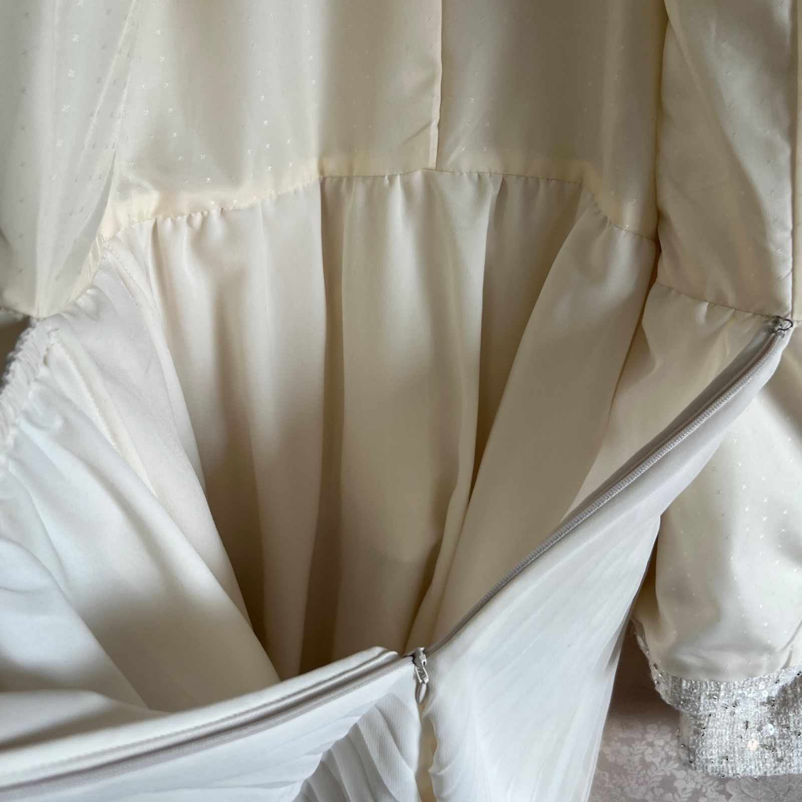 上身頃は繊細なラメ糸を織り込んだツイード生地で仕立てられ、