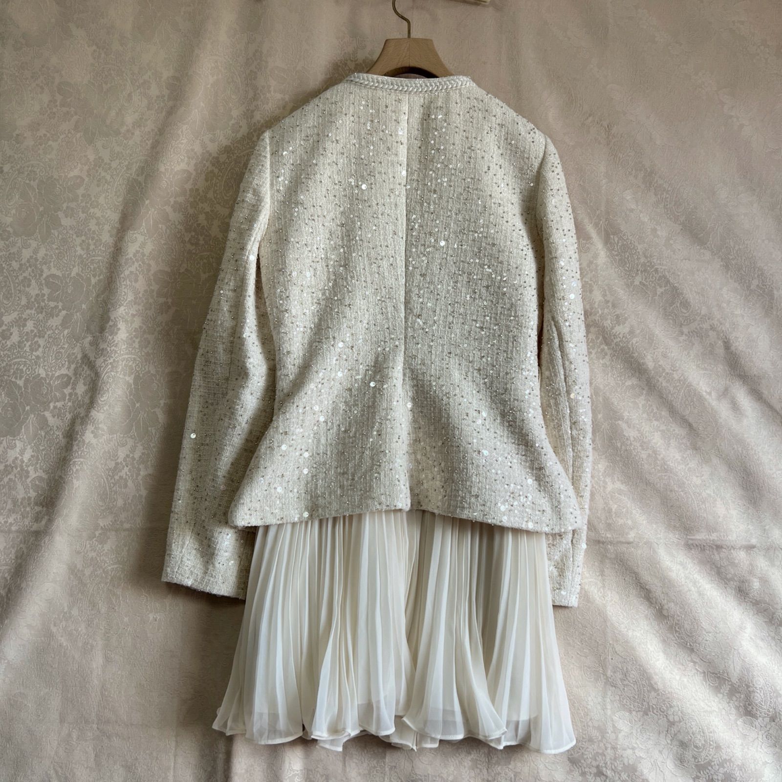 ・華やかなツイード素材とプリーツの異素材コンビが上品