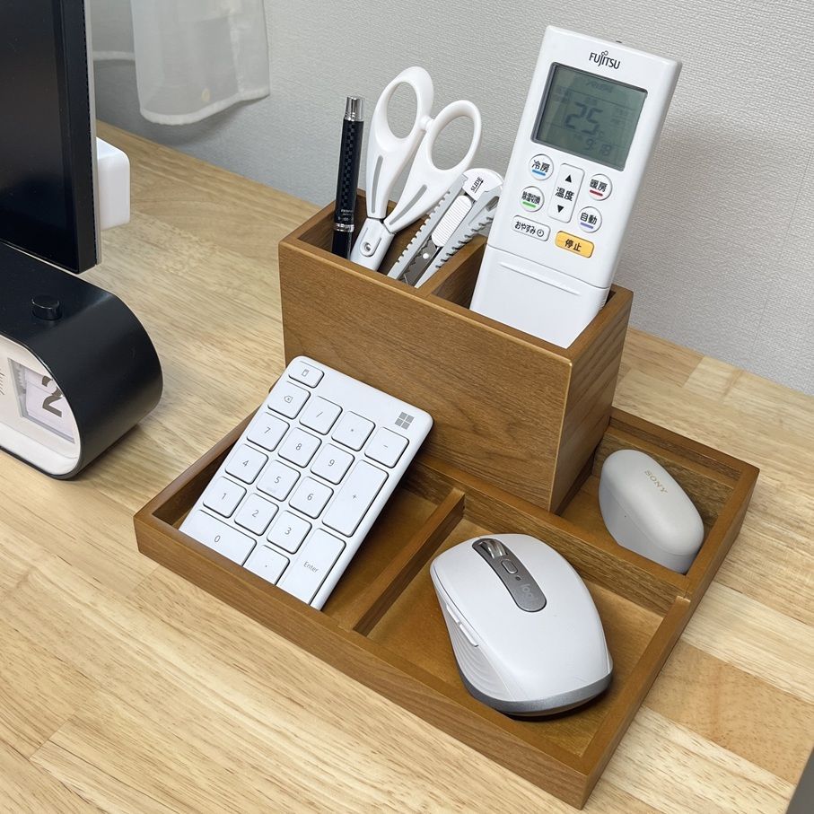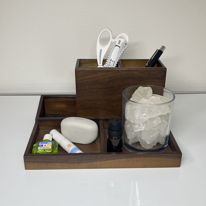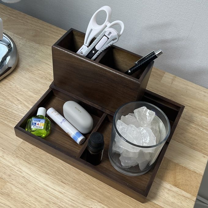 デスクでは、ペンやハサミ、目薬、イヤホンなどの細かなアイテムをまとめてすっきりと。