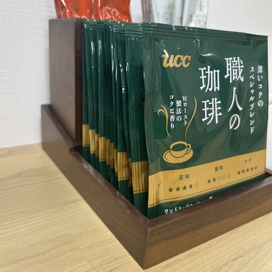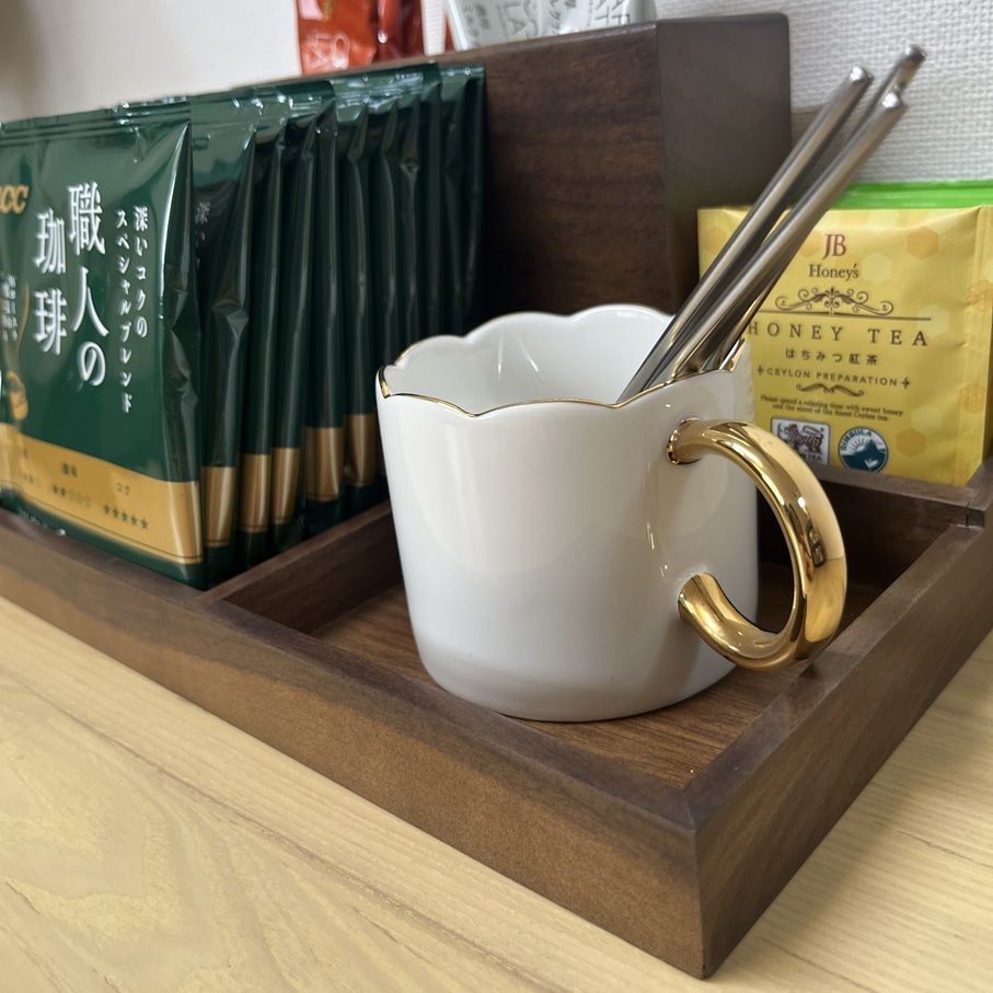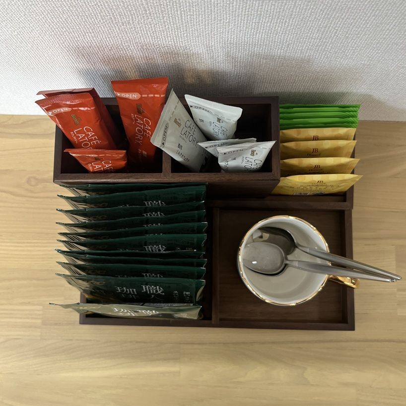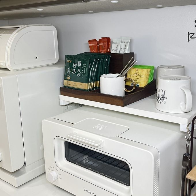 キッチンでは、コーヒー・紅茶・お茶パックなどを種類ごとに分けて入れておくと、毎日の準備がスムーズに。