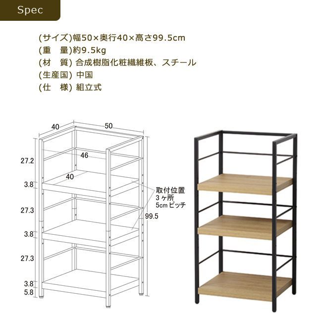 【商品サイズ】約 幅50×奥行40×高さ99.5cm 【重 量】約 9.5kg 【JAN】4954877234852(ヴィンテージブラウン) 4954877234869(モダンナチュラル) 【材 質】合成樹脂化粧繊維板、スチール 【仕 様】組立式 【生産国】中国