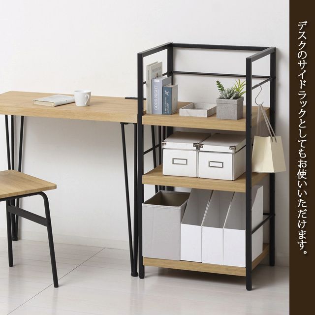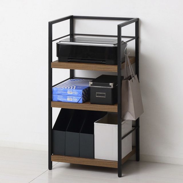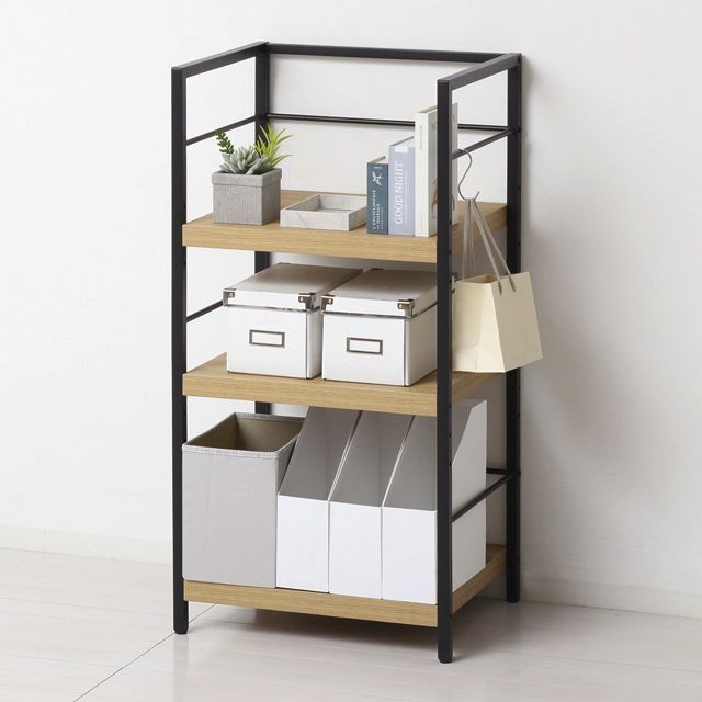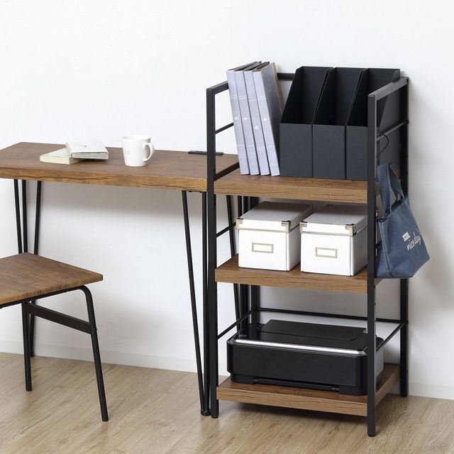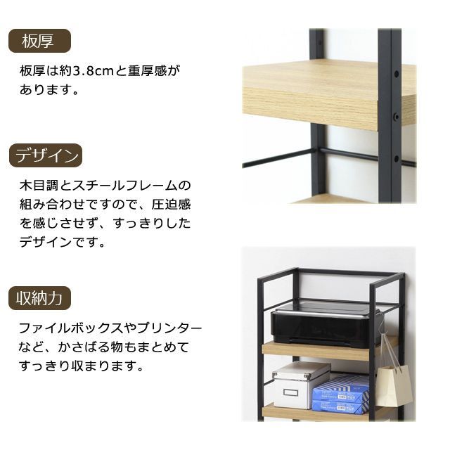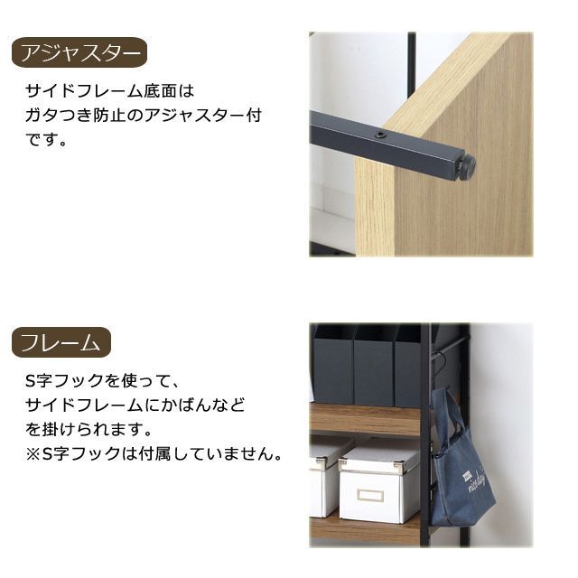 場所を選ばず使える便利なラックです! ◆棚板は、凹凸のあるエンボス加工で高級感があり、合成樹脂ですので傷がつきにくく、お手入れが簡単です。 ◆板厚は約3.8cmと重厚感があります。 ◆棚板2枚の位置は、組立時に3段階(5cmピッチ)でお選びいただけます。 ◆ファイルボックスやプリンターなど、かさばる物もまとめてすっきり収まります。 ◆サイドフレームの底面はガタつき防止のアジャスター付です。 ◆S字フックを使って、サイドフレームにかばんなどを掛けられます。 ◆木目調とスチールフレームの組み合わせですので、圧迫感を感じさせず、すっきりしたデザインです。 ◆リビングやキッチンなど場所を選ばずお使いいただけます。 ◆お部屋に合わせやすいナチュラルとブラウンの2色展開です。