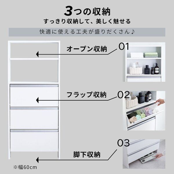 収納目安(幅60/フラップ1段):フェイスタオル約14枚、衣類約9枚