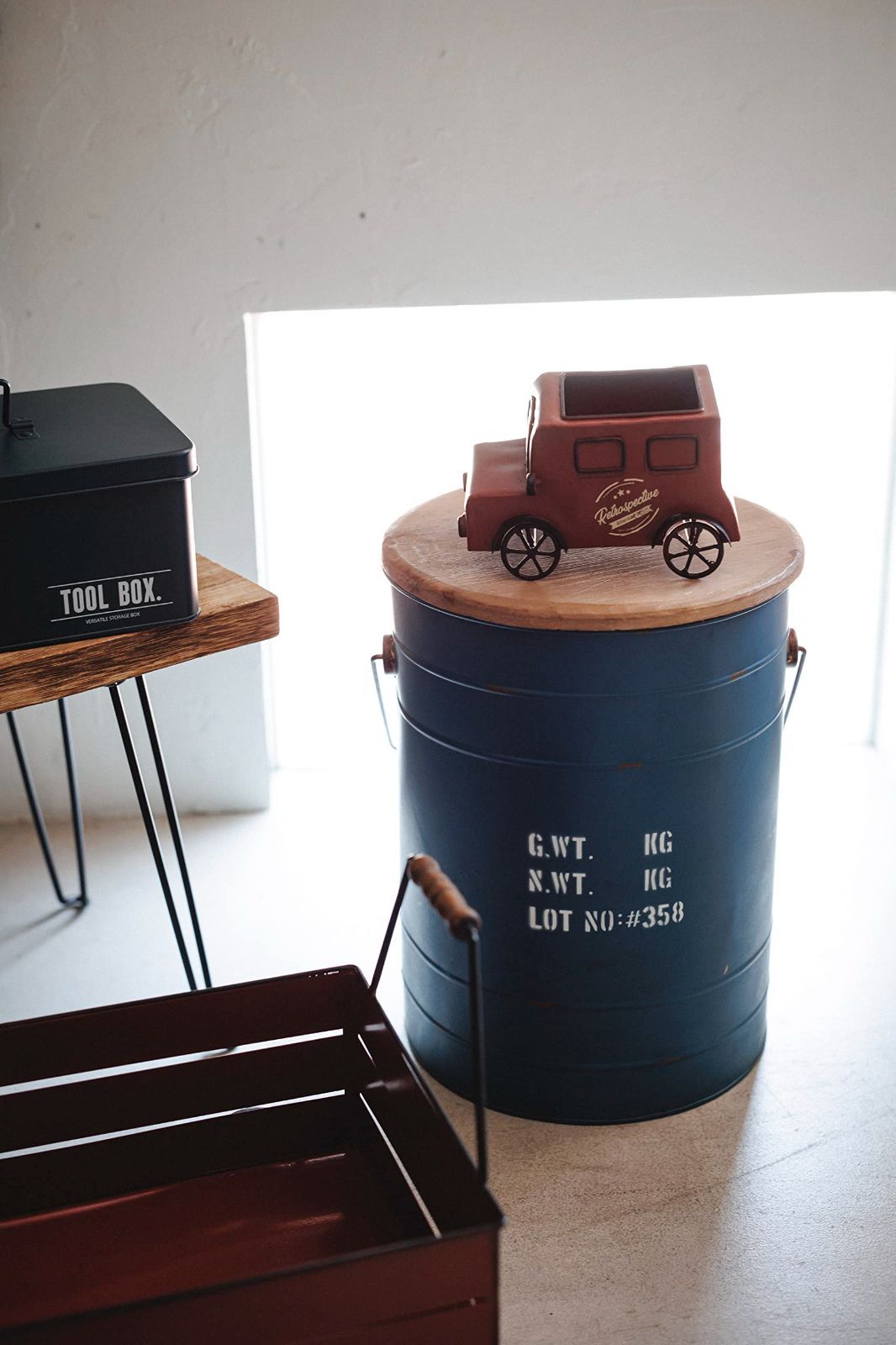 中身を隠せて蓋に座れるドラム缶型収納ボックス
