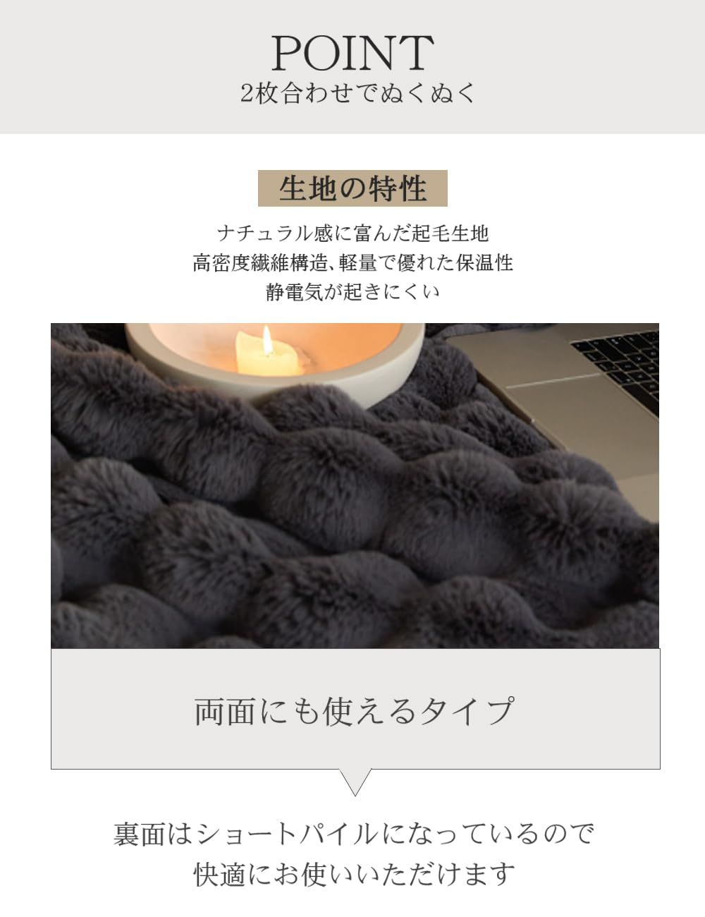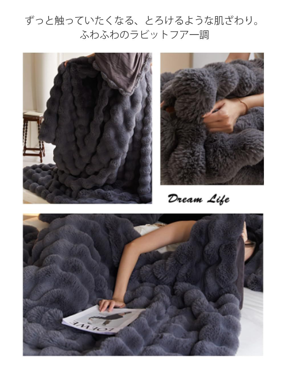 【高品質な素材&二枚合わせ毛布】 VERILADYの毛布はラビットファー風の二枚合わせ仕様で、両面がふわふわな素材。高級感があり、保温性も抜群です。おしゃれなお部屋のアクセントにもなり、寒い冬でも暖かく過ごせるブランケットです。ふんわり柔らかくしっとりとした肌触りで、心も体も温まります。耐久性に優れた生地で、ふわふわな触り心地を長くお楽しみいただけます。