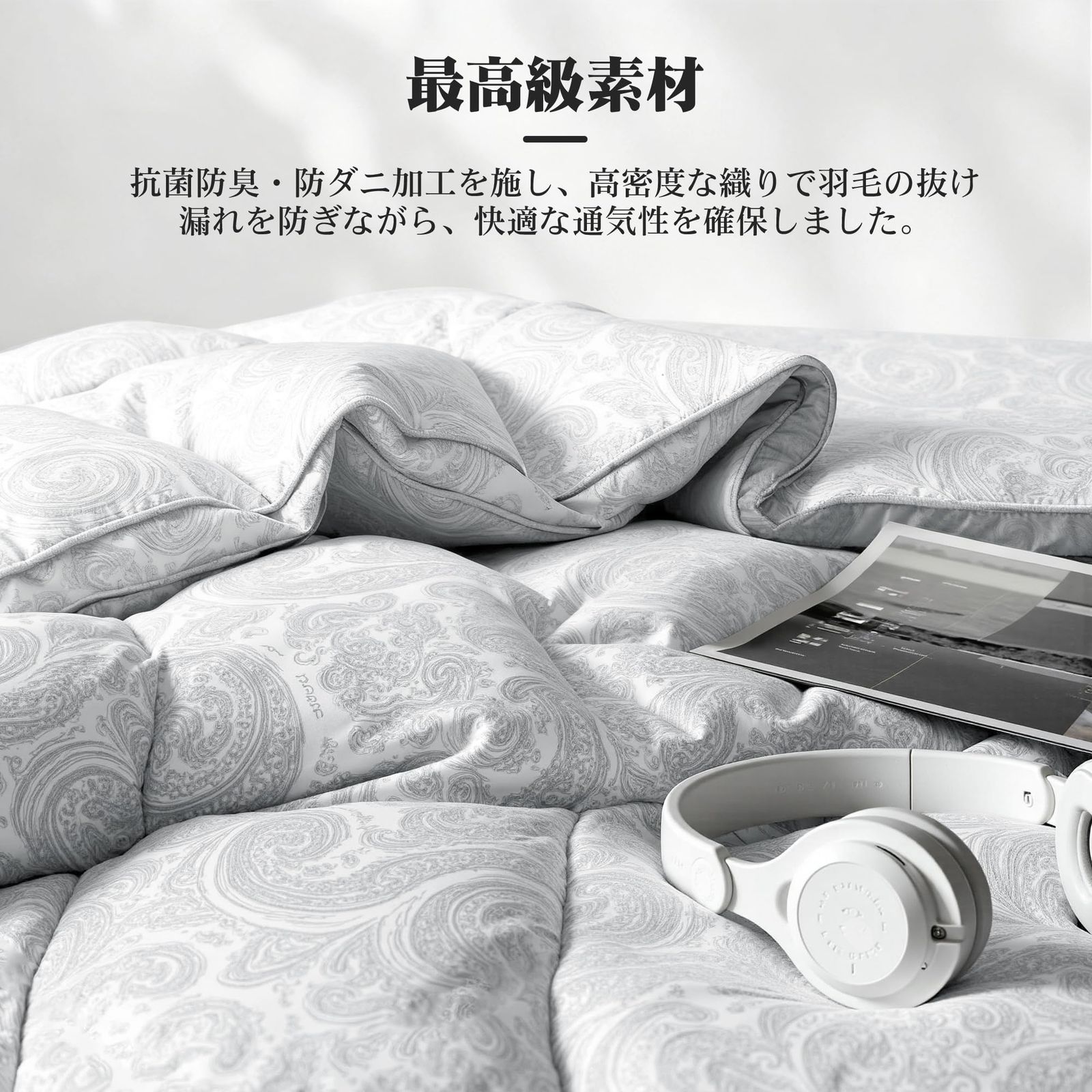 肌ざわり最高の通気綿生地肌に触れる側は高密度で織られた柔らかい綿生地。サラッとした肌ざわりと通気性で、蒸れずに快適。羽毛の抜け漏れも防ぎます。