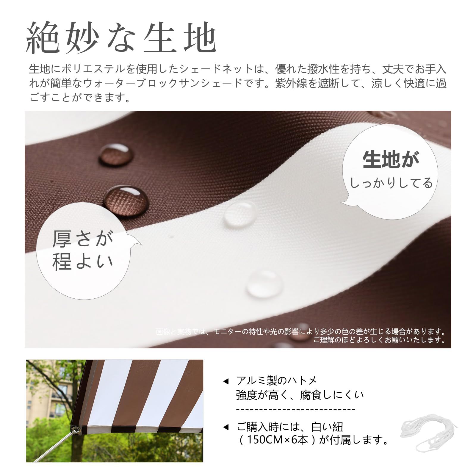 生地に300Dポリエステルを使用したシェードネットは、優れた撥水効果のシェードです、急な雨からも洗濯物などを守ってくれます。