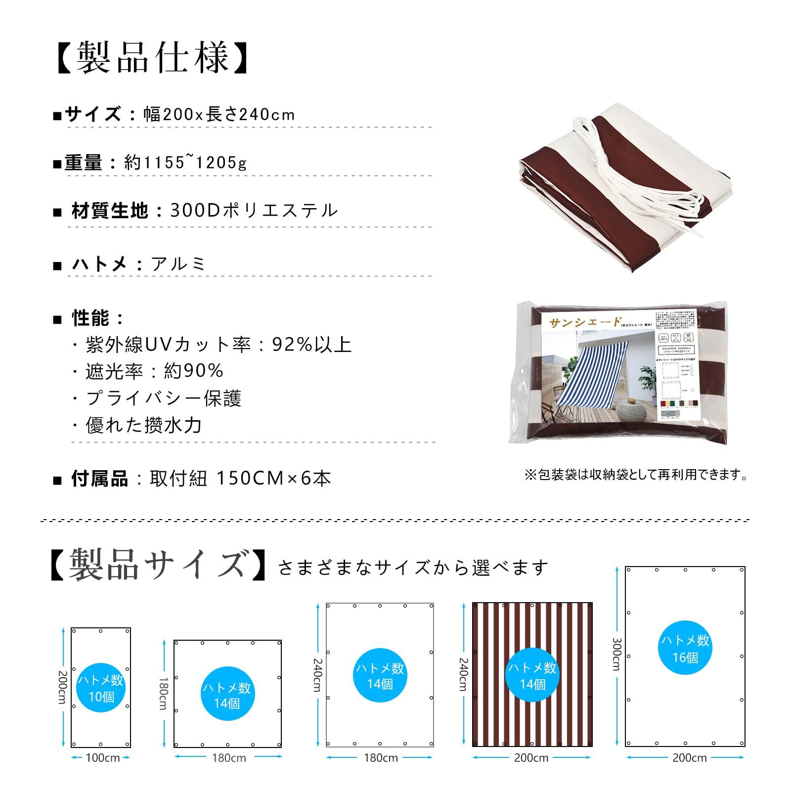 錆びないのゴールデンアルミハトメが付いているので、付属品:6本x1.5m取付けひも、ベランダや窓ペ、廊下、庭下、庭先、玄関などに簡単に取り付けることができます。お洒落なデザインなので、日よけだけでなく、ご自宅やお庭のエクステリアとしてもご利用なれます。