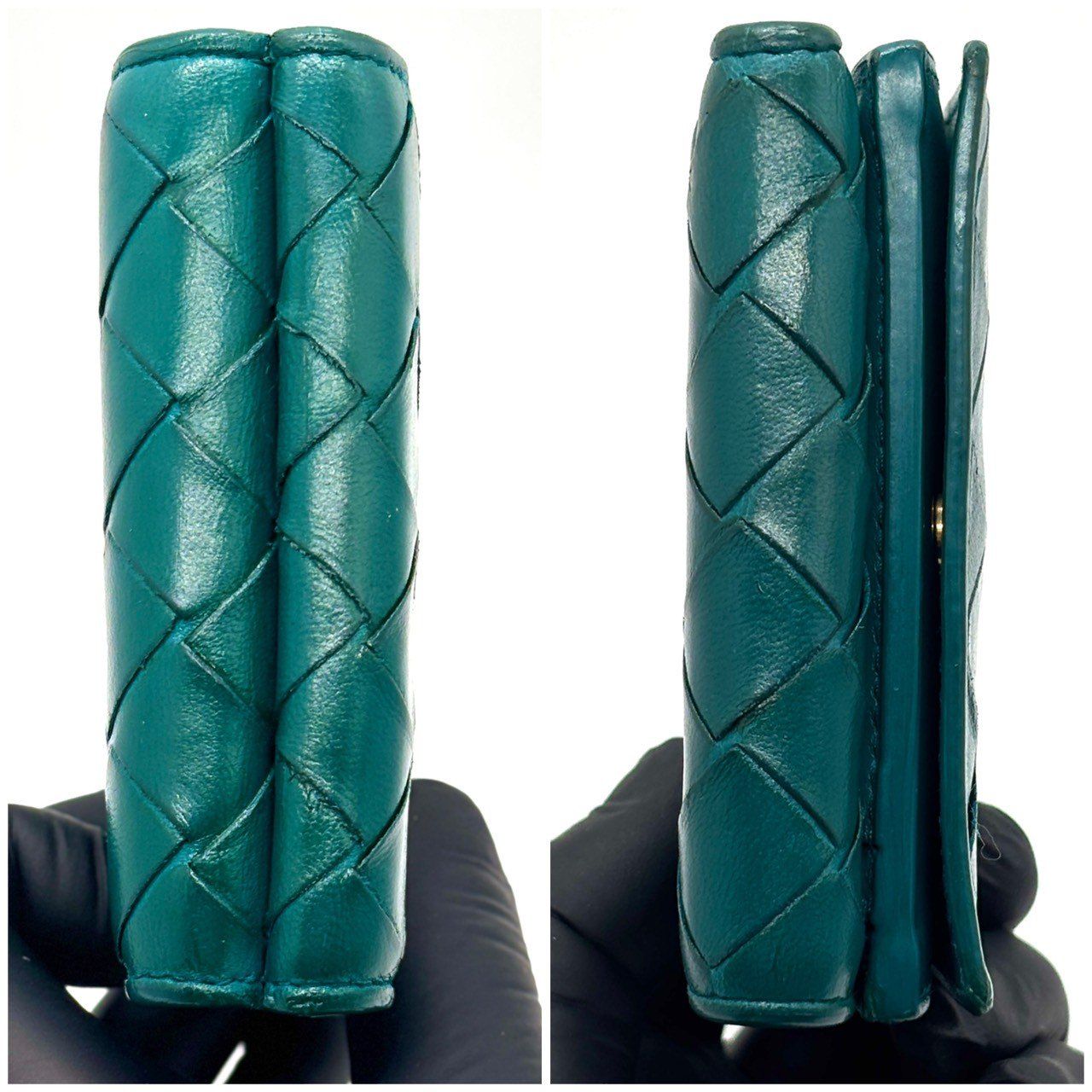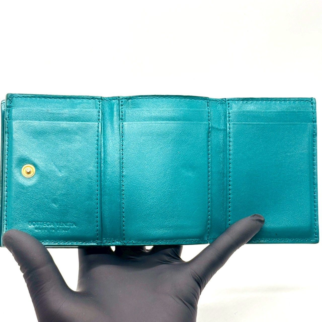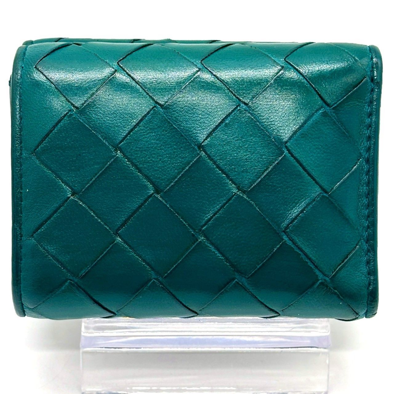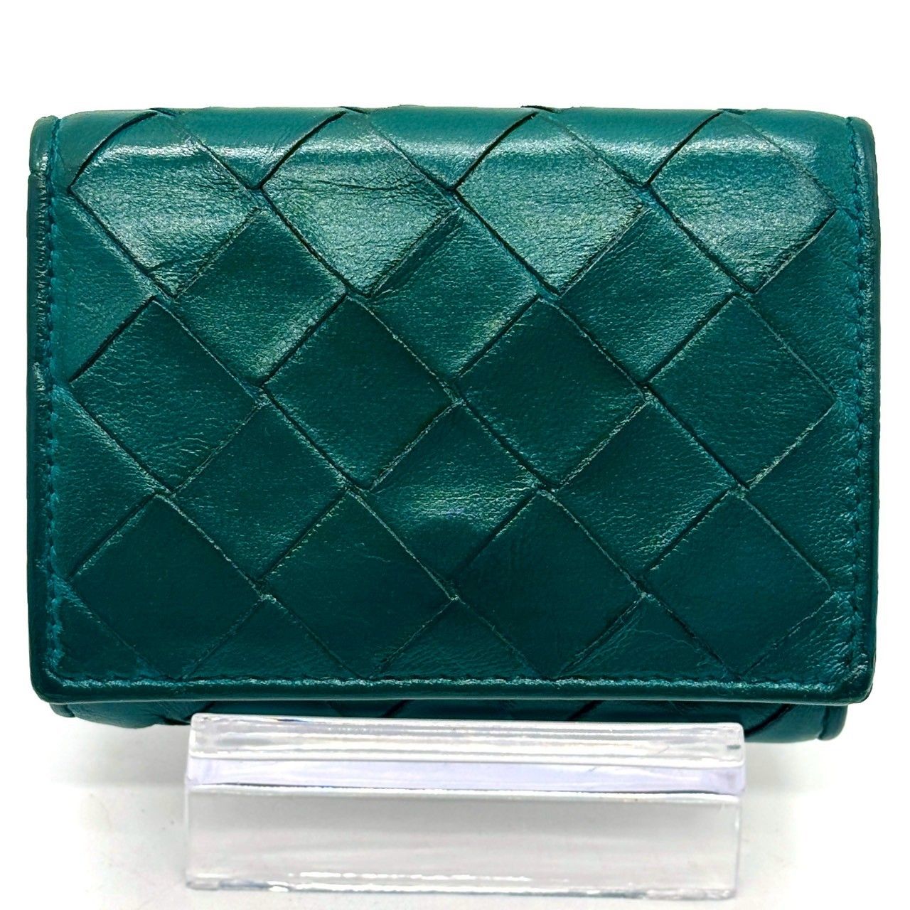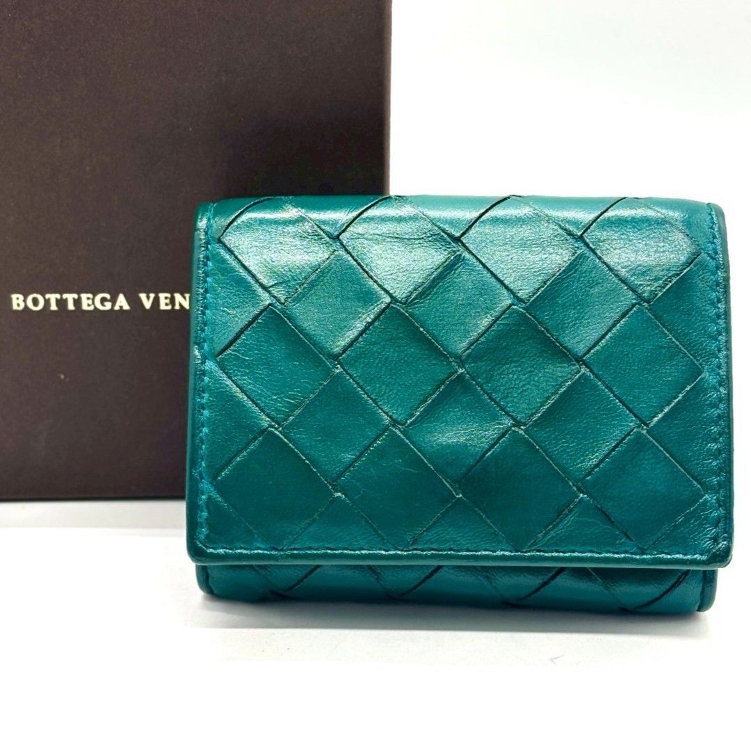 ・柔らかなラムレザーを手作業で編み込んだ、ボッテガヴェネタのイントレチャート三つ折り財布。鮮やかで品のあるティールグリーンがポイントで、上質感をさりげなく纏える一品です。手に収まるサイズながら札入れ・カード収納・小銭入れを備え実用性も十分。長く愛用できる革財布を探す方におすすめです。