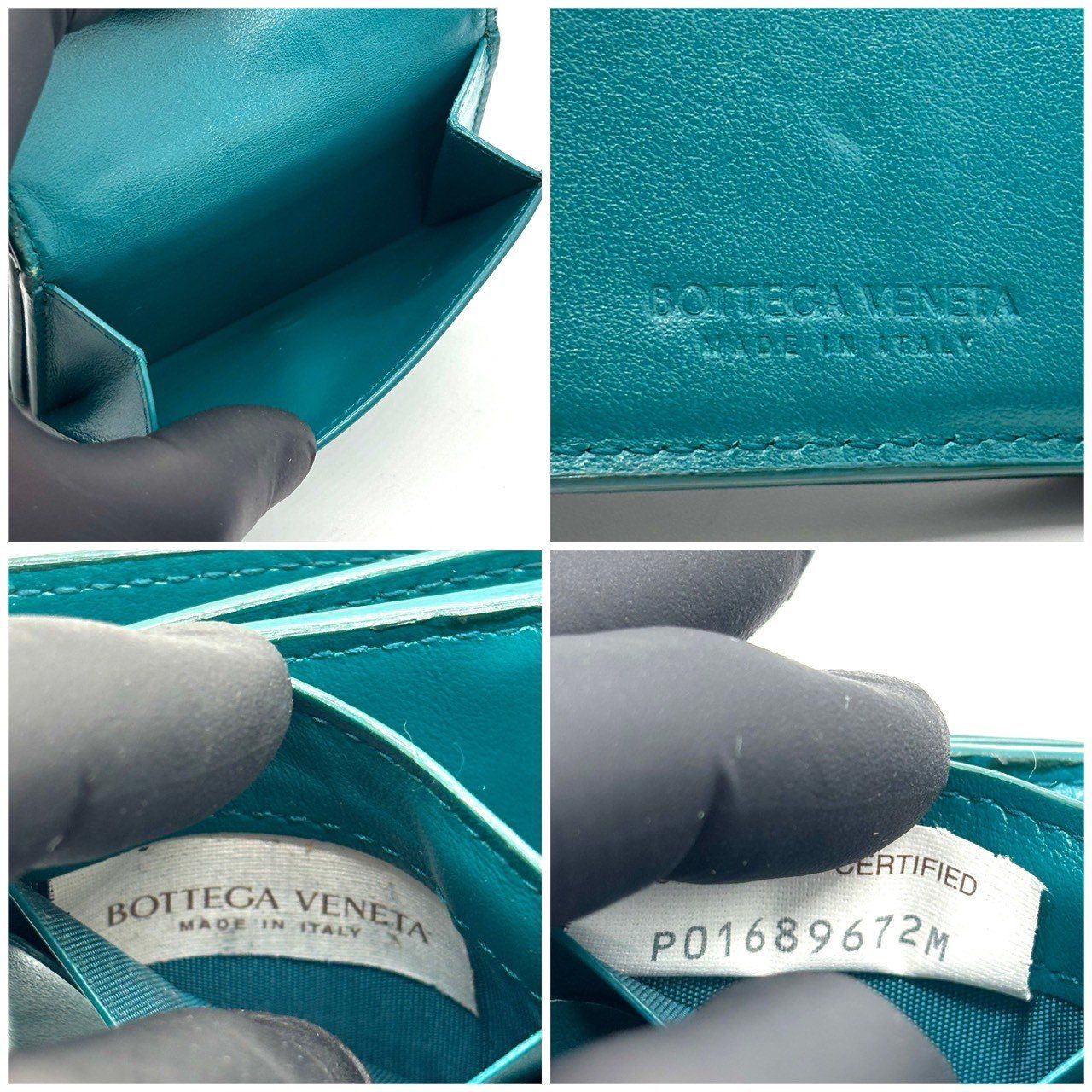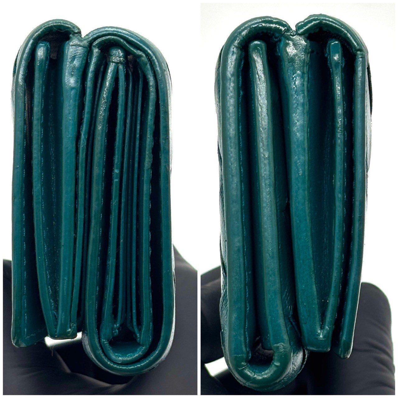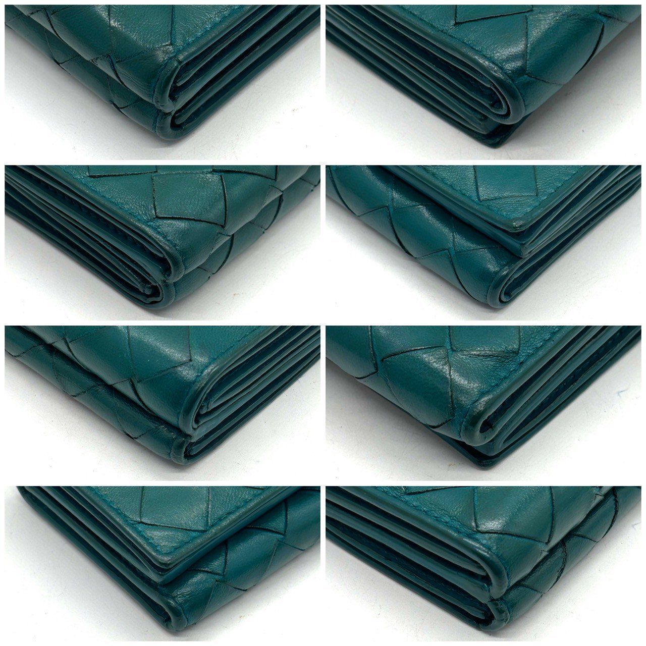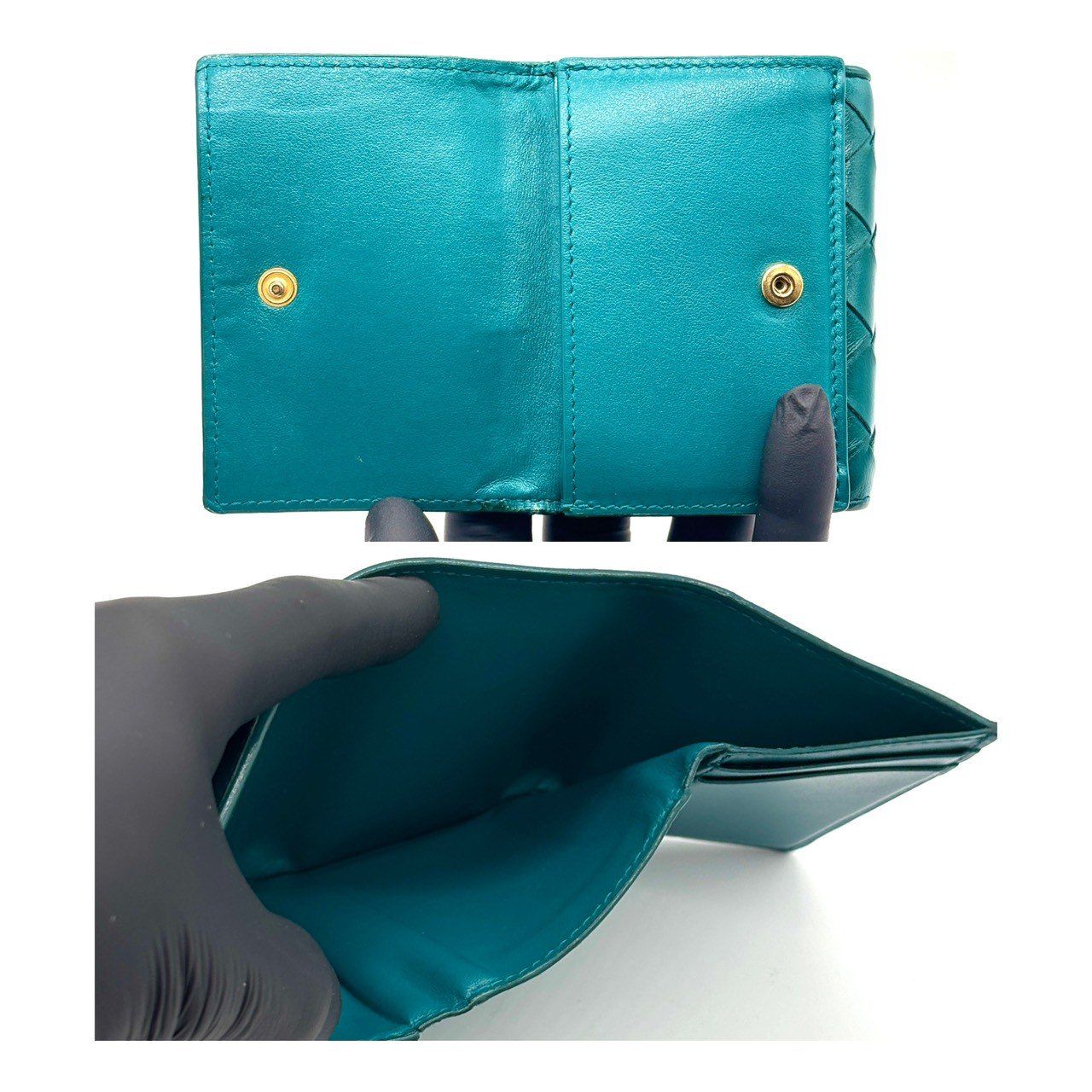 ・柔らかなラムレザーを手作業で編み込んだ、ボッテガヴェネタのイントレチャート三つ折り財布。鮮やかで品のあるティールグリーンがポイントで、上質感をさりげなく纏える一品です。手に収まるサイズながら札入れ・カード収納・小銭入れを備え実用性も十分。長く愛用できる革財布を探す方におすすめです。