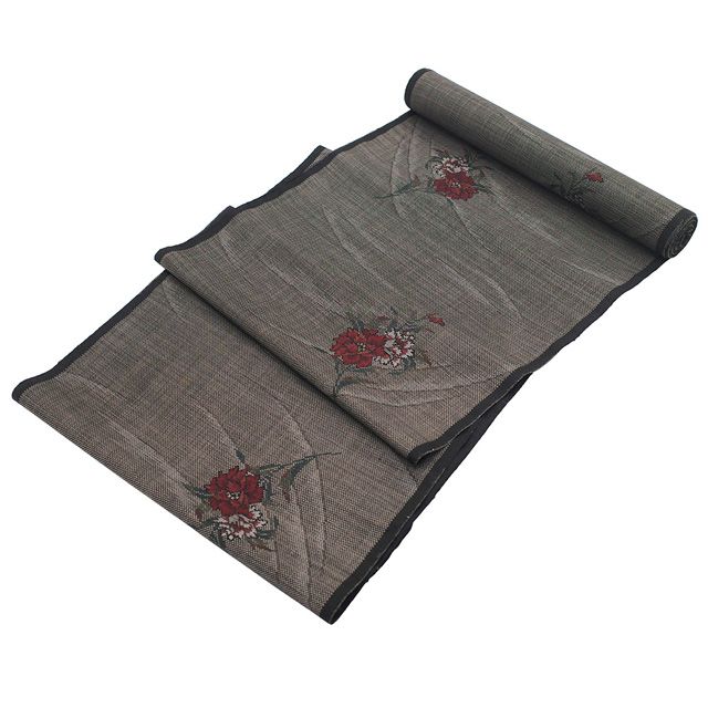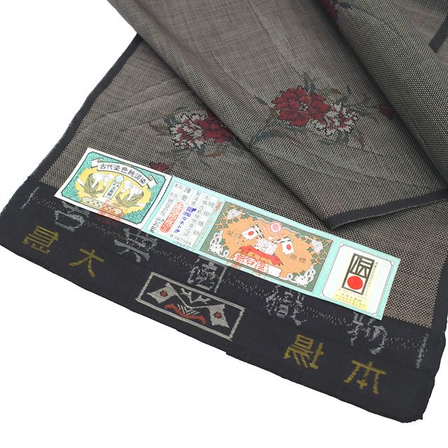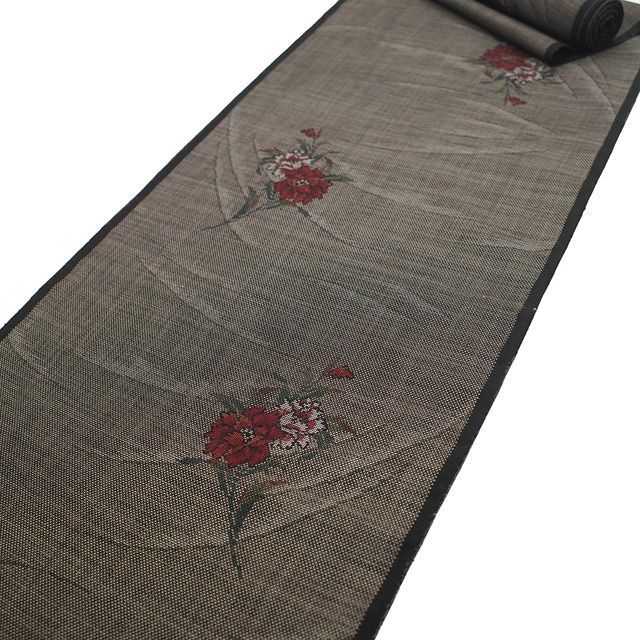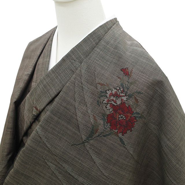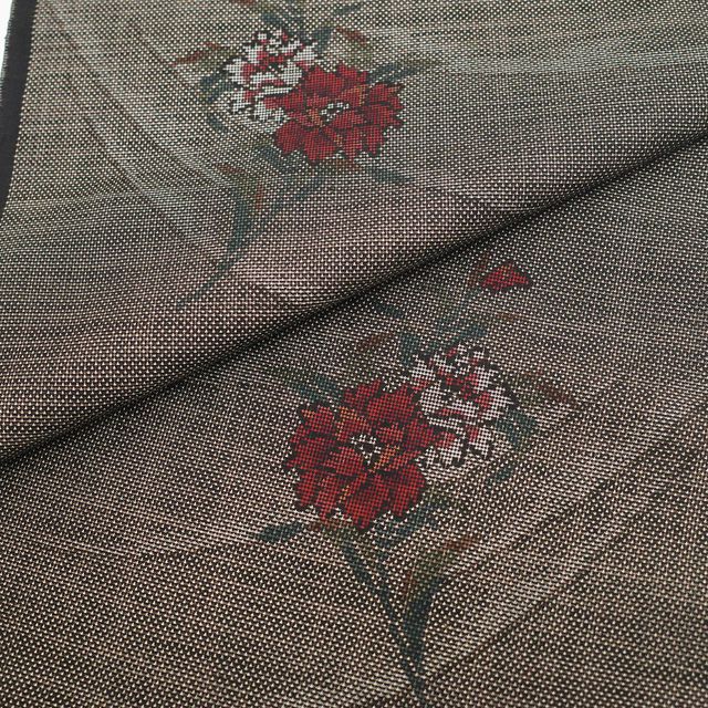 こちらのお品は、大島紬らしい粋なこげ茶色地にカーネーションが織り上げられています。