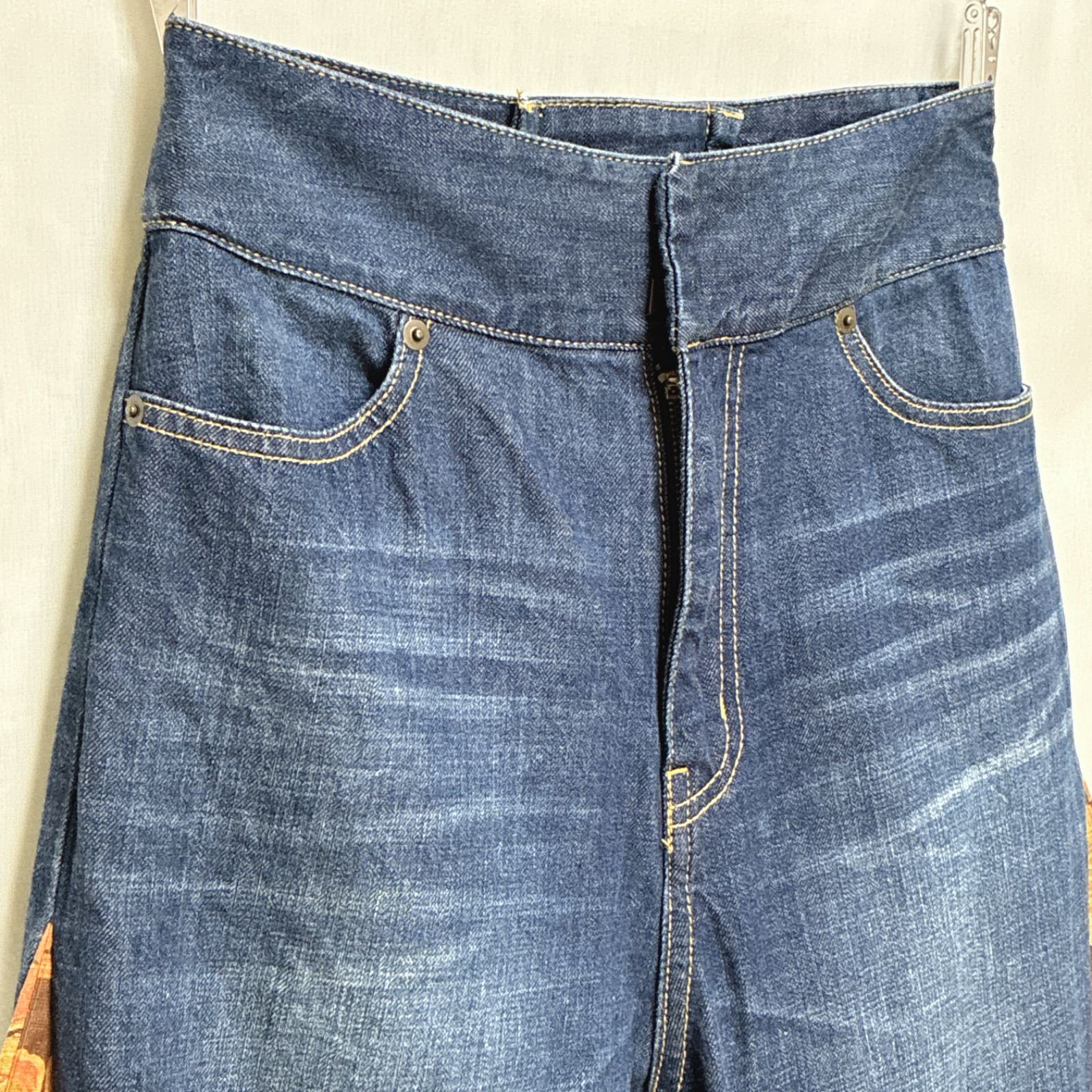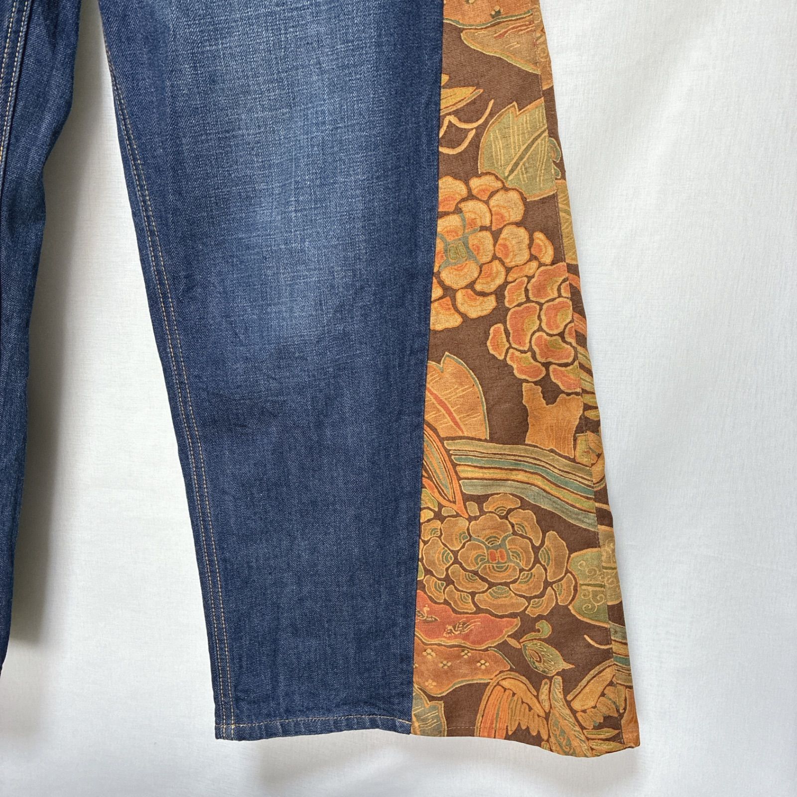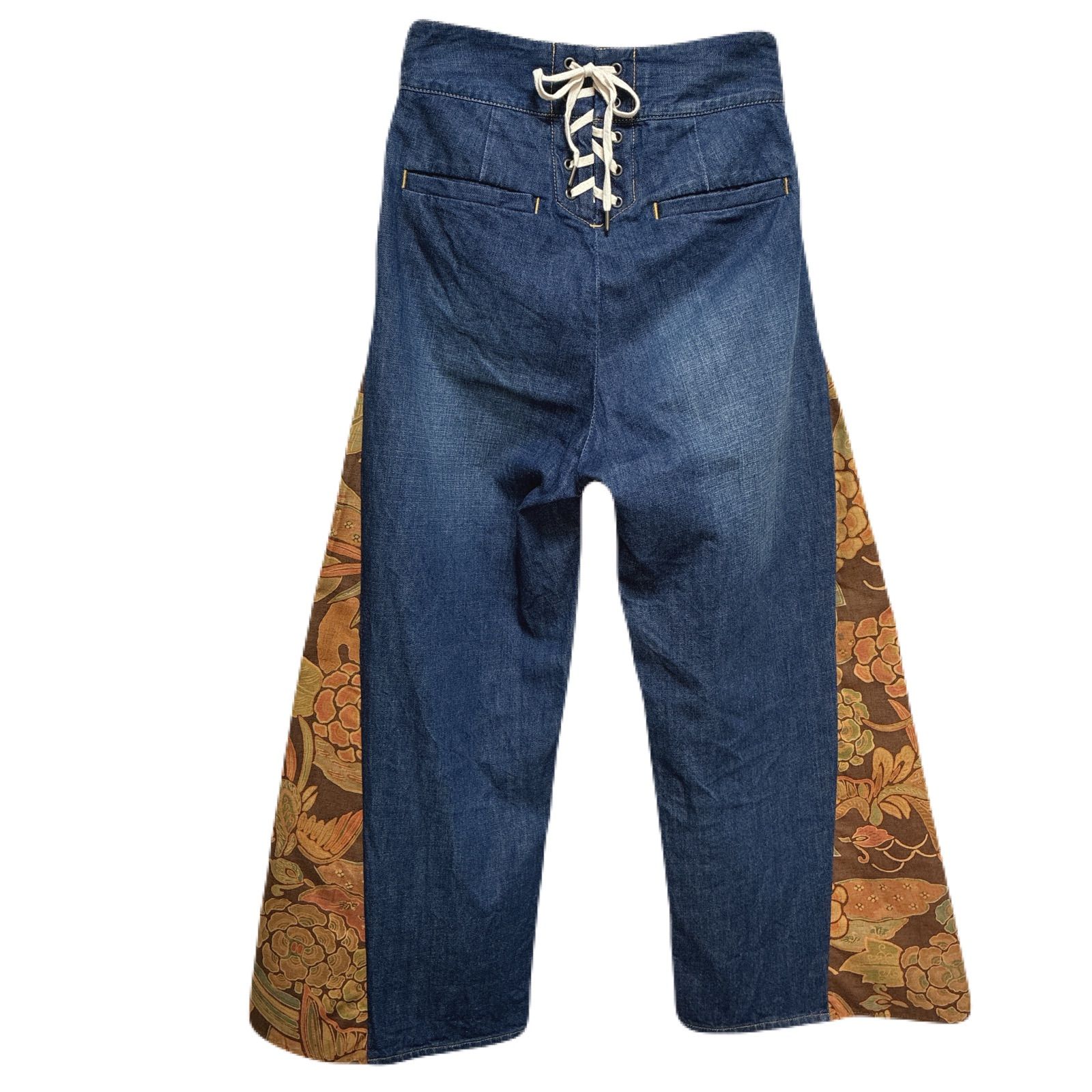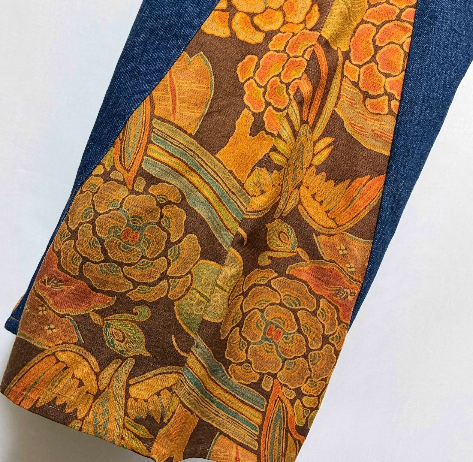 花と鳥のような柄の着物をデニムのサイドに付けてフレアデニムにしました。